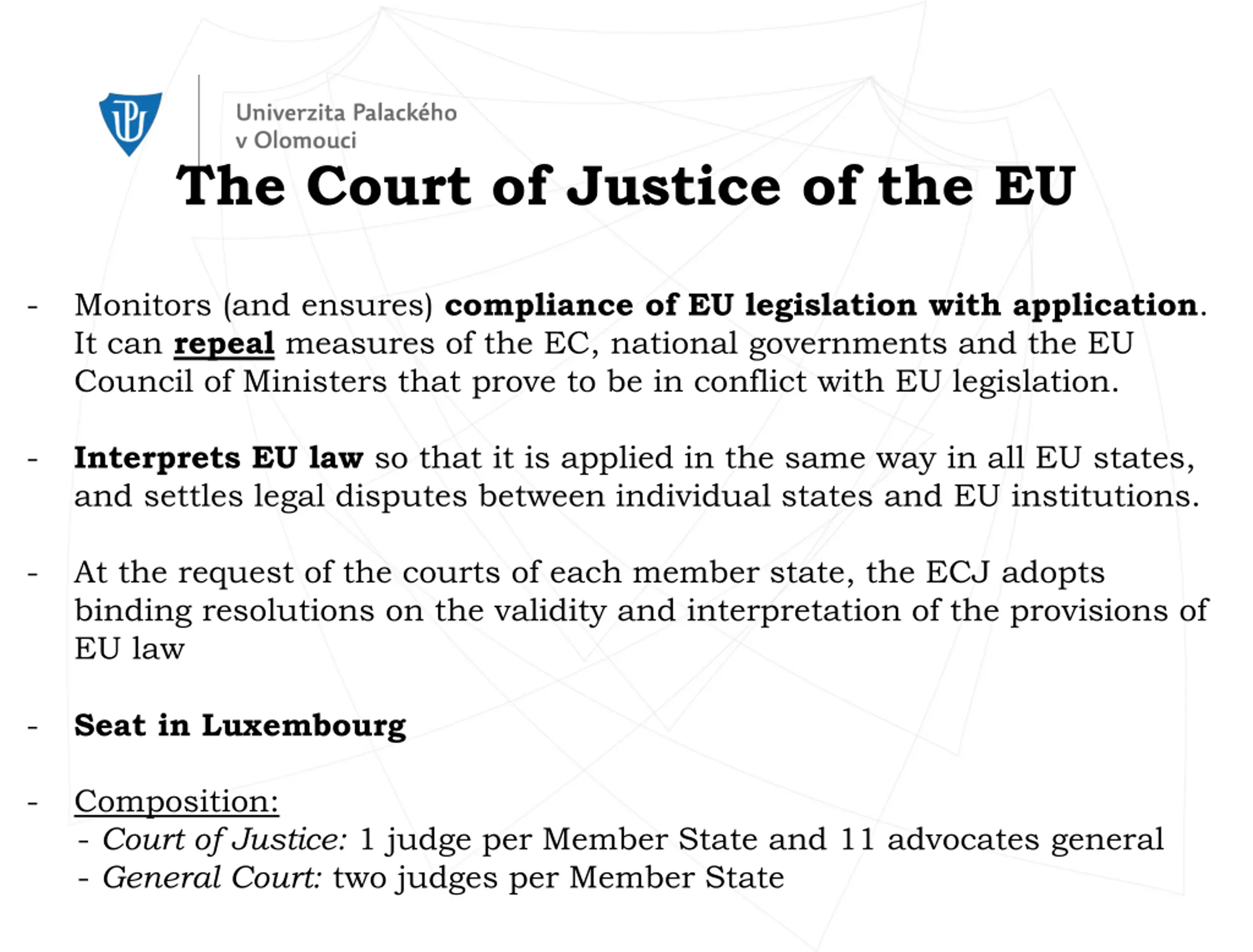 The Court of Justice of the EU - Monitors (and ensures) compliance of EU legislation with application. It can repeal measures of the EC, national governments and the EU Council of Ministers that prove to be in conflict with EU legislation. - Interprets EU law so that it is applied in the same way in all EU states, and settles legal disputes between individual states and EU institutions. - At the request of the courts of each member state, the ECJ adopts binding resolutions on the validity and interpretation of the provisions of EU law - Seat in Luxembourg - Composition: - Court of Justice: 1 judge per Member State and 11 advocates general - General Court: two judges per Member State