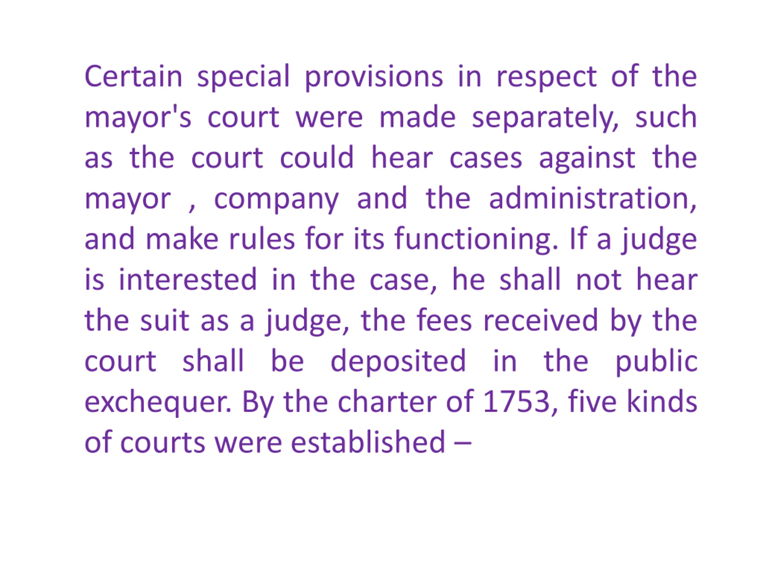 Certain special provisions in respect of the mayor's court were made separately, such as the court could hear cases against the mayor , company and the administration, and make rules for its functioning. If a judge is interested in the case, he shall not hear the suit as a judge, the fees received by the court shall be deposited in the public exchequer. By the charter of 1753, five kinds of courts were established
