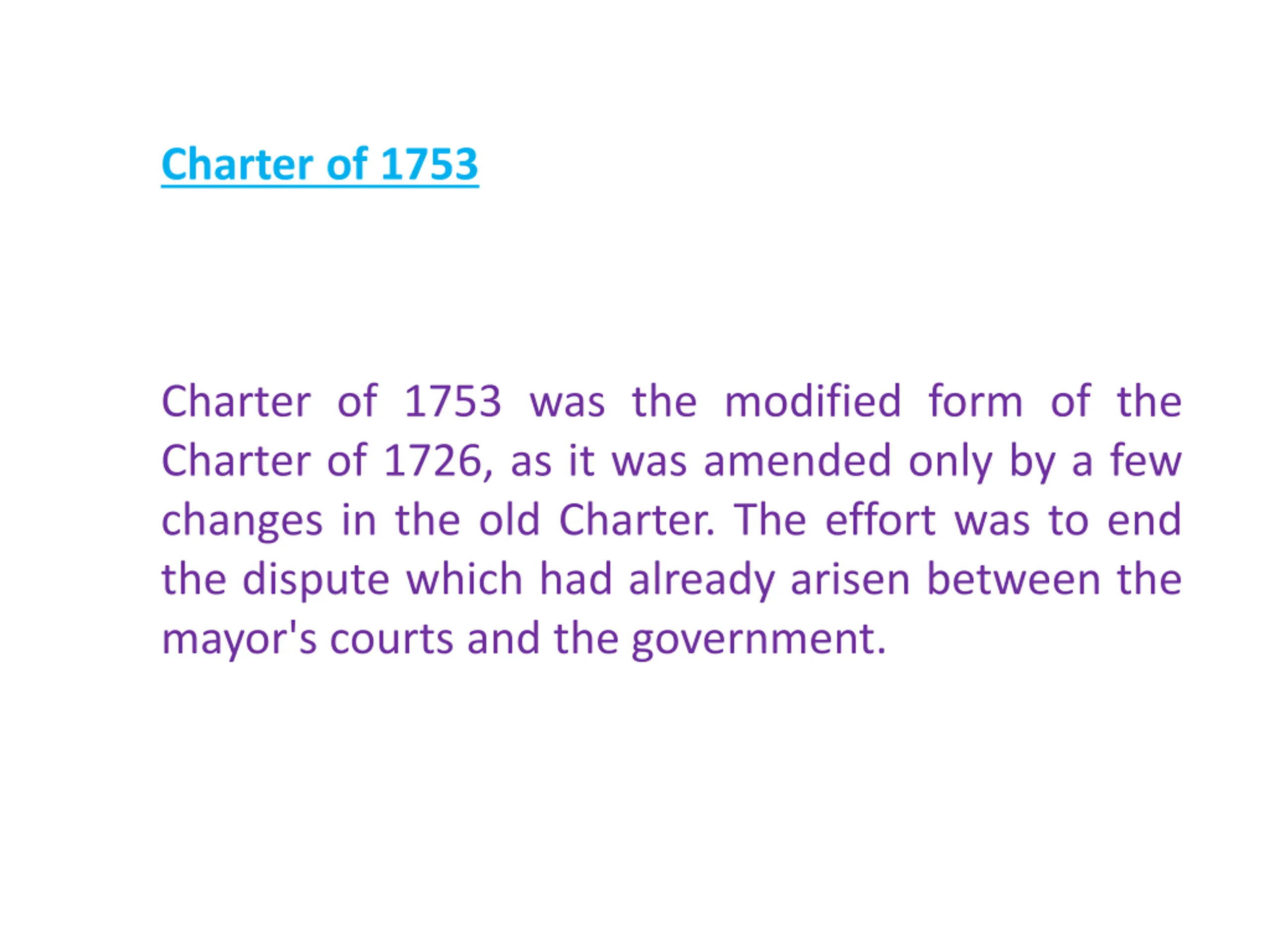Charter of 1753 Charter of 1753 was the modified form of the Charter of 1726, as it was amended only by a few changes in the old Charter. The effort was to end the dispute which had already arisen between the mayor's courts and the government.