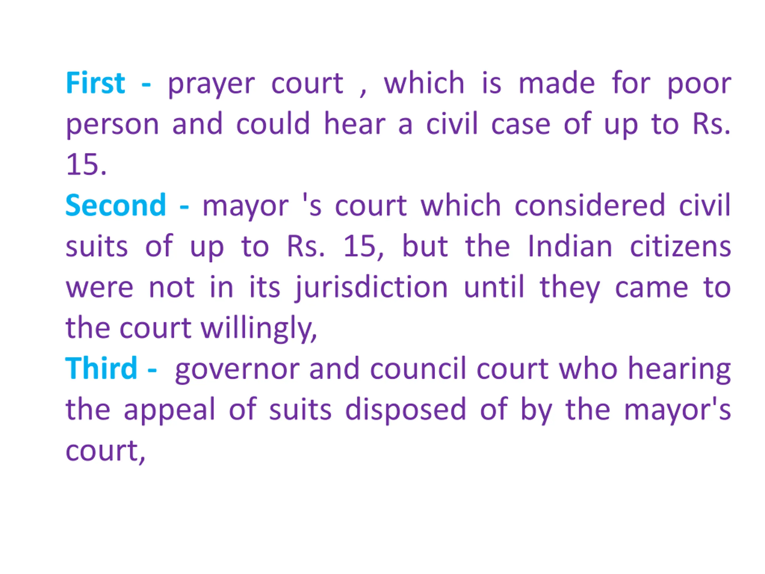 First - prayer court , which is made for poor person and could hear a civil case of up to Rs. 15. Second - mayor 's court which considered civil suits of up to Rs. 15, but the Indian citizens were not in its jurisdiction until they came to the court willingly, Third - governor and council court who hearing the appeal of suits disposed of by the mayor's court,