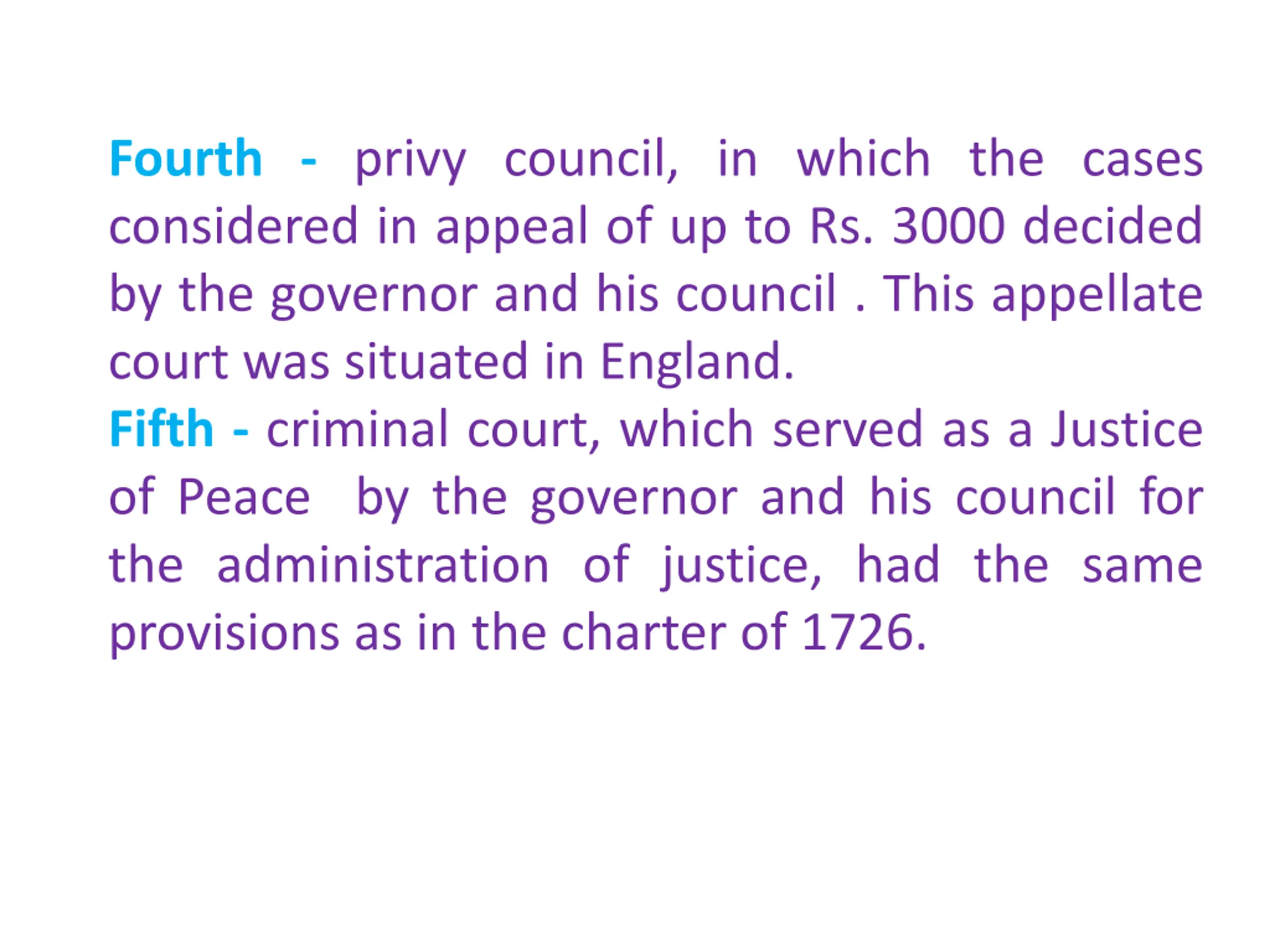 Fourth - privy council, in which the cases considered in appeal of up to Rs. 3000 decided by the governor and his council . This appellate court was situated in England. Fifth - criminal court, which served as a Justice of Peace by the governor and his council for the administration of justice, had the same provisions as in the charter of 1726.