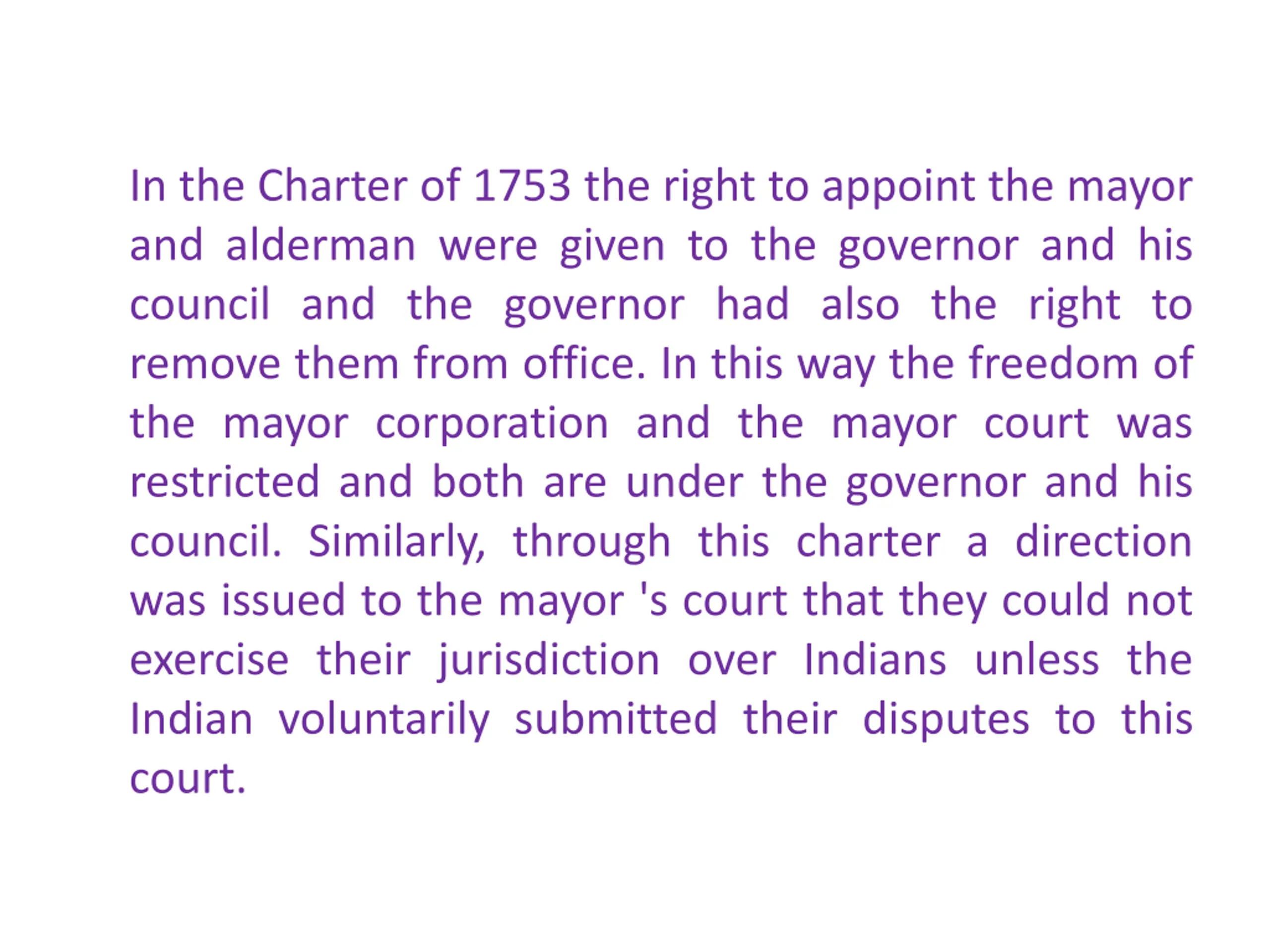 In the Charter of 1753 the right to appoint the mayor and alderman were given to the governor and his council and the governor had also the right to remove them from office. In this way the freedom of the mayor corporation and the mayor court was restricted and both are under the governor and his council. Similarly, through this charter a direction was issued to the mayor 's court that they could not exercise their jurisdiction over Indians unless the Indian voluntarily submitted their disputes to this court.