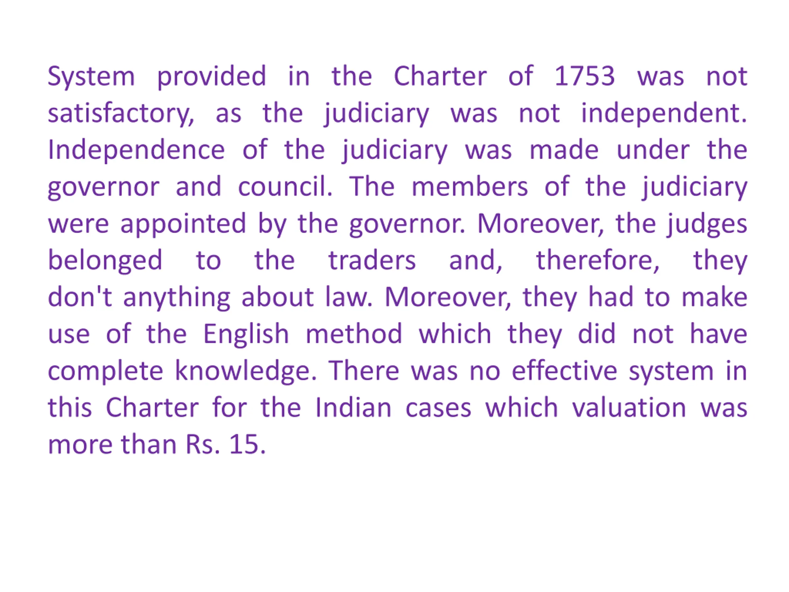 System provided in the Charter of 1753 was not satisfactory, as the judiciary was not independent. Independence of the judiciary was made under the governor and council. The members of the judiciary were appointed by the governor. Moreover, the judges belonged to the traders and, therefore, they don't anything about law. Moreover, they had to make use of the English method which they did not have complete knowledge. There was no effective system in this Charter for the Indian cases which valuation was more than Rs. 15.