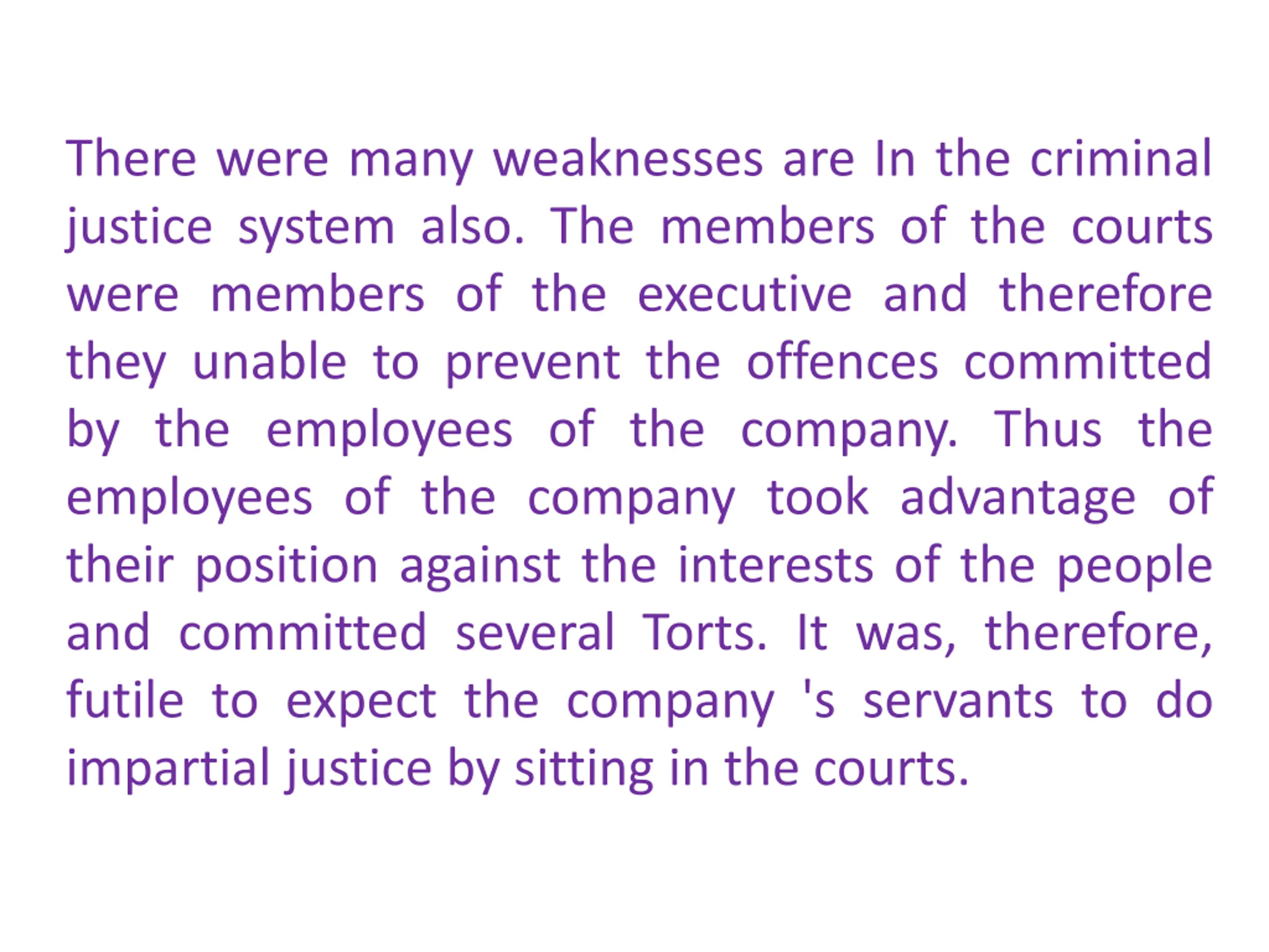 There were many weaknesses are In the criminal justice system also. The members of the courts were members of the executive and therefore they unable to prevent the offences committed by the employees of the company. Thus the employees of the company took advantage of their position against the interests of the people and committed several Torts. It was, therefore, futile to expect the company 's servants to do impartial justice by sitting in the courts.