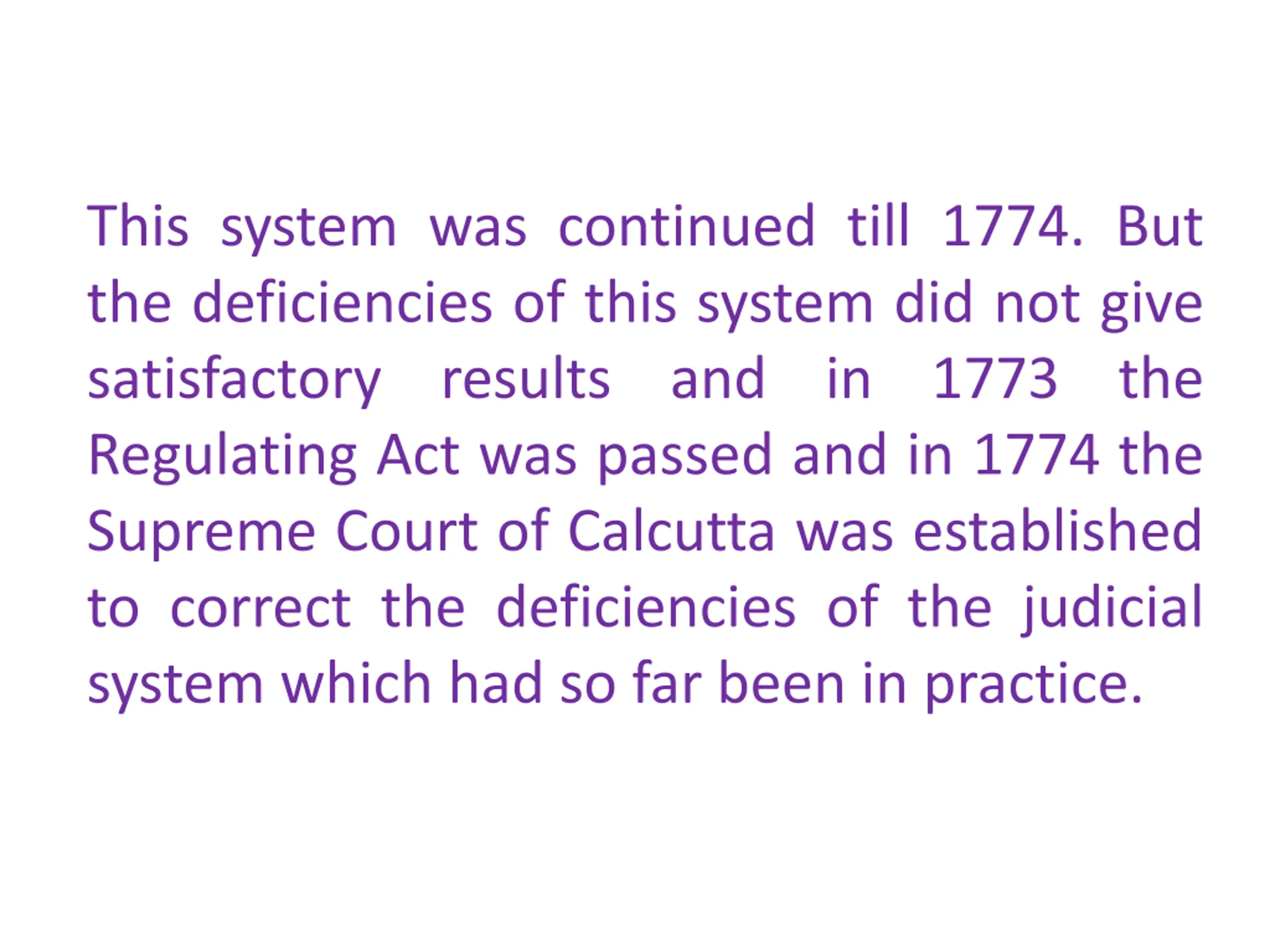 This system was continued till 1774. But the deficiencies of this system did not give satisfactory results and in 1773 the Regulating Act was passed and in 1774 the Supreme Court of Calcutta was established to correct the deficiencies of the judicial system which had so far been in practice.