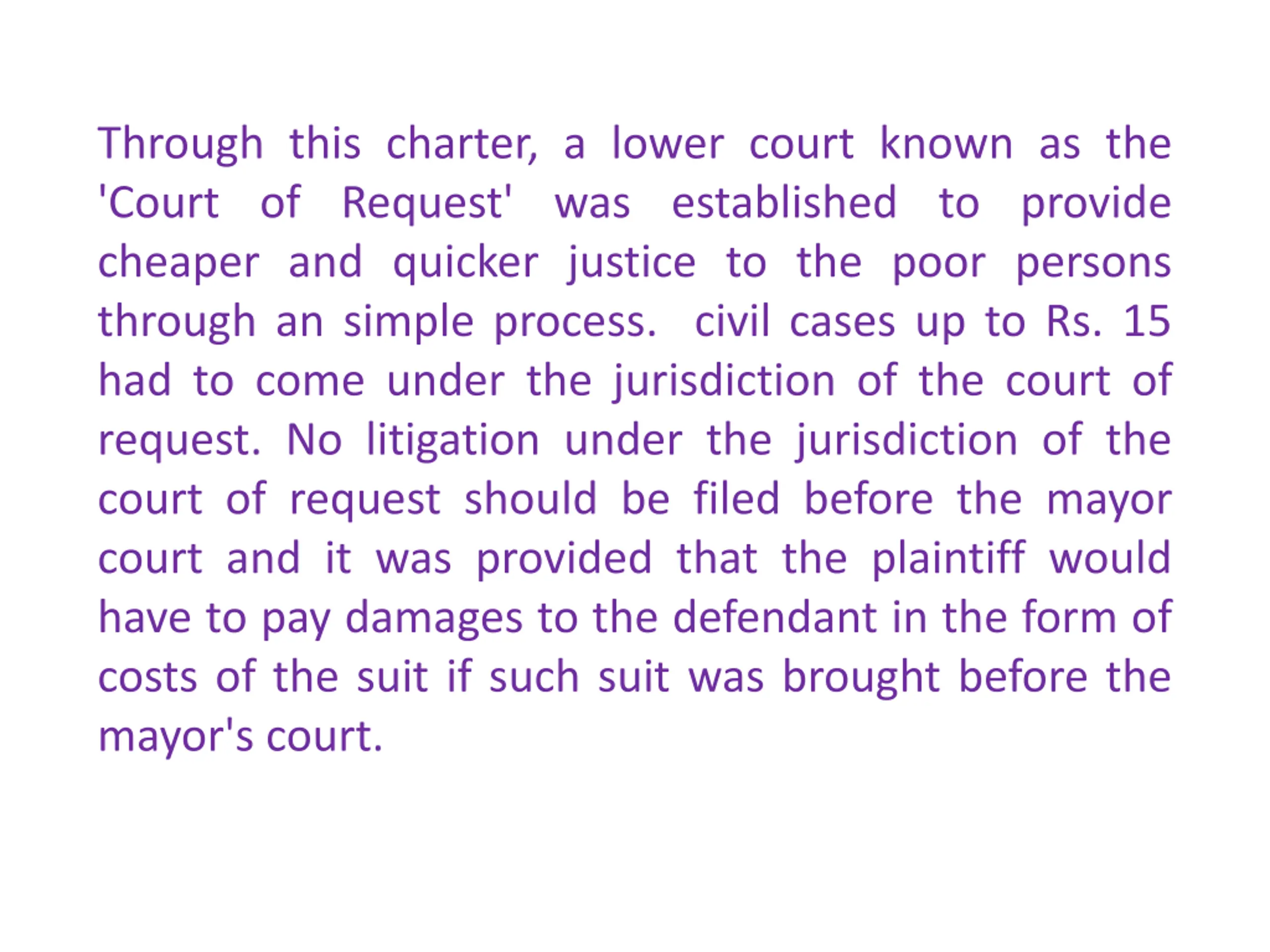 Through this charter, a lower court known as the 'Court of Request' was established to provide cheaper and quicker justice to the poor persons through an simple process. civil cases up to Rs. 15 had to come under the jurisdiction of the court of request. No litigation under the jurisdiction of the court of request should be filed before the mayor court and it was provided that the plaintiff would have to pay damages to the defendant in the form of costs of the suit if such suit was brought before the mayor's court.