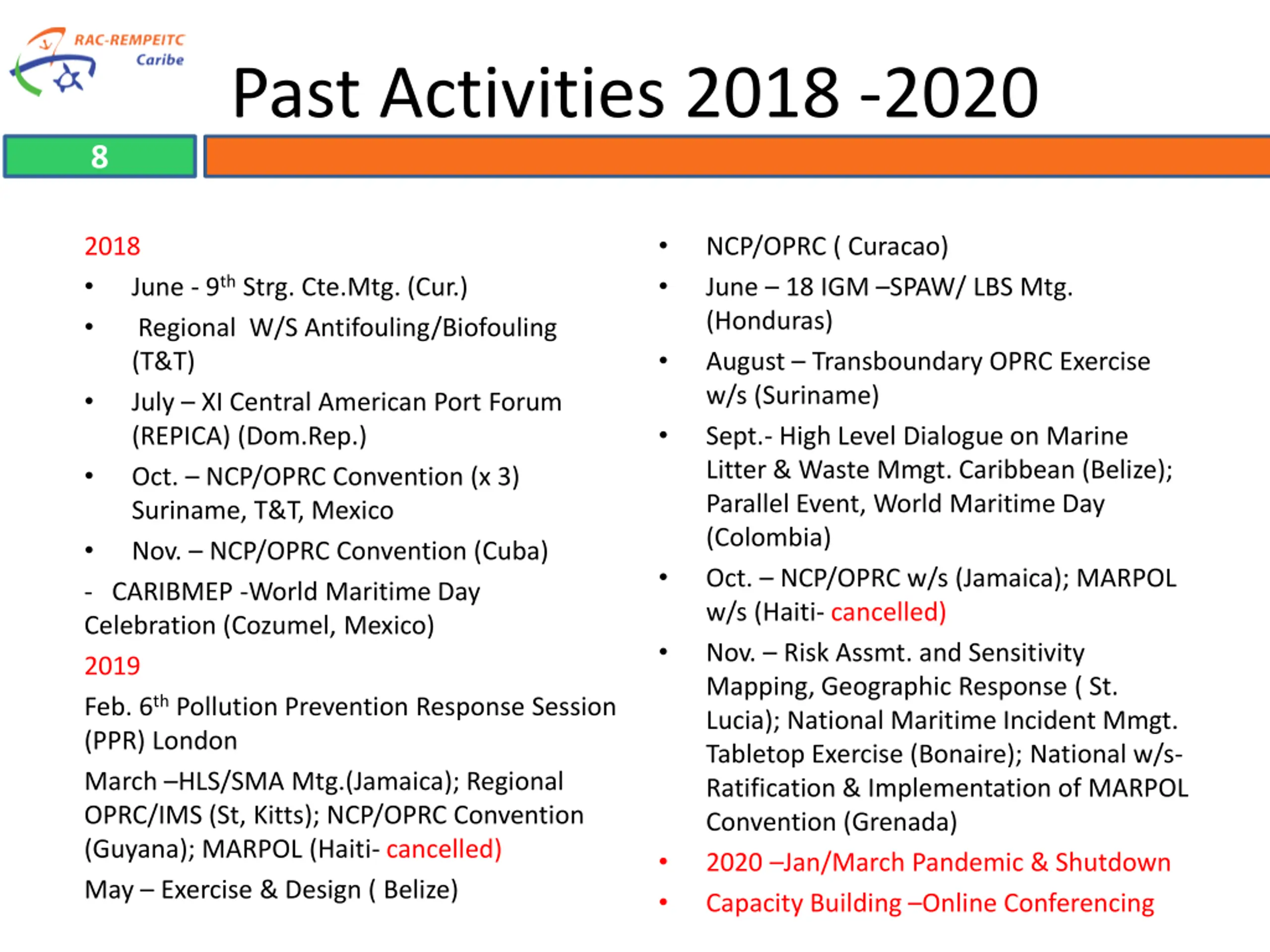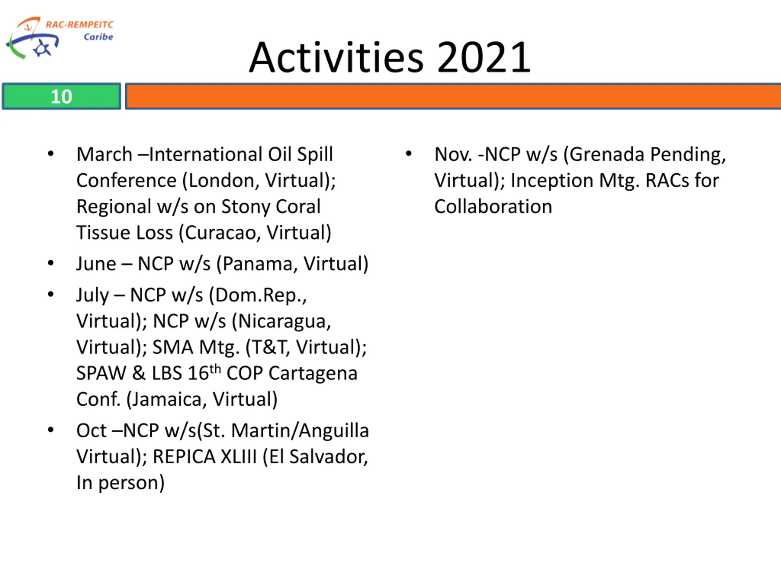 Activities 2021 10 March International Oil Spill Conference (London, Virtual); Regional w/s on Stony Coral Tissue Loss (Curacao, Virtual) June NCP w/s (Panama, Virtual) July NCP w/s (Dom.Rep., Virtual); NCP w/s (Nicaragua, Virtual); SMA Mtg. (T&T, Virtual); SPAW & LBS 16th COP Cartagena Conf. (Jamaica, Virtual) Oct NCP w/s(St. Martin/Anguilla Virtual); REPICA XLIII (El Salvador, In person) Nov. -NCP w/s (Grenada Pending, Virtual); Inception Mtg. RACs for Collaboration
