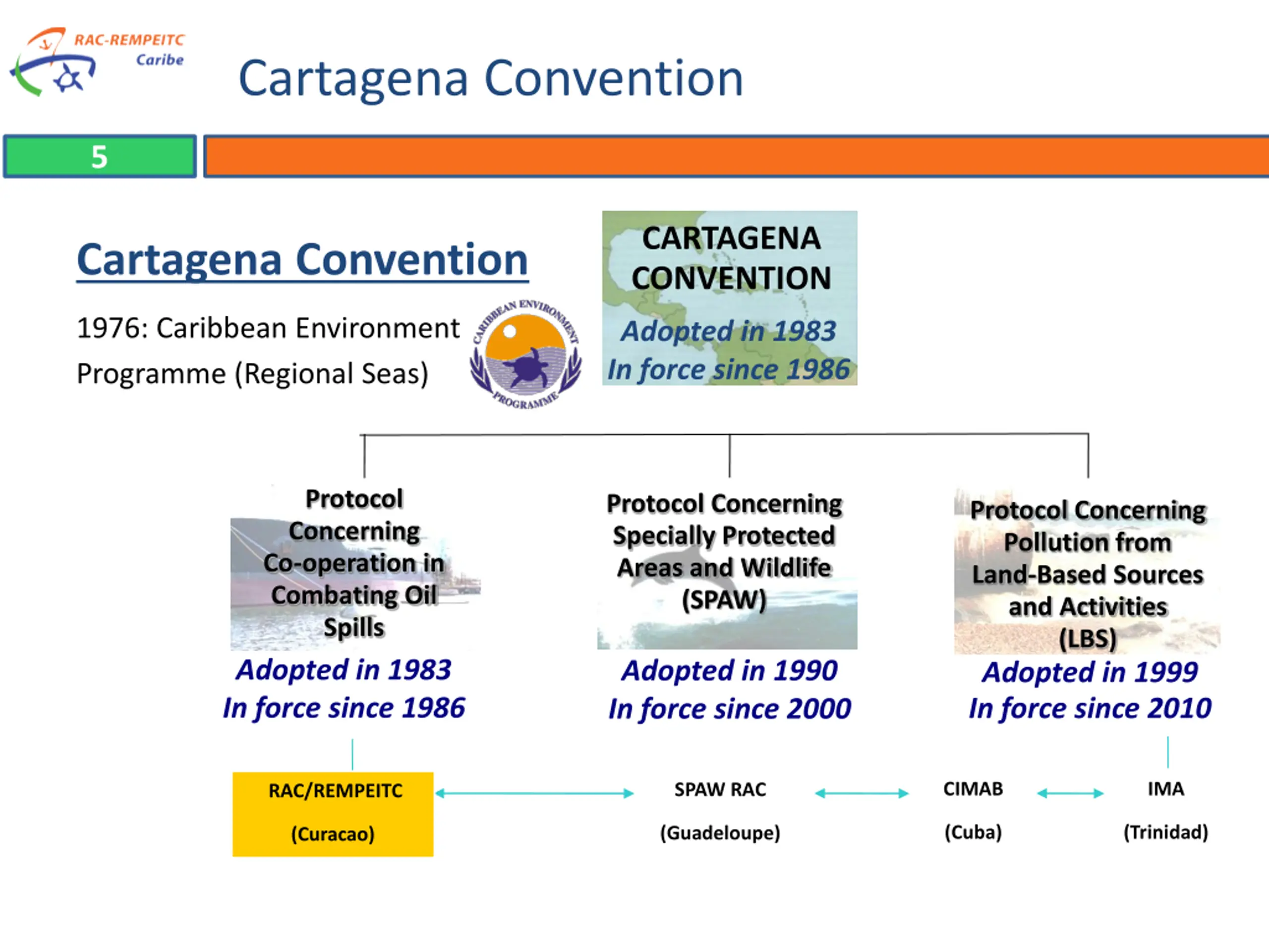 Cartagena Convention 5 CARTAGENA CONVENTION Cartagena Convention 1976: Caribbean Environment Programme (Regional Seas) Adopted in 1983 In force since 1986 Protocol Concerning Co-operation in Combating Oil Spills Adopted in 1983 In force since 1986 Protocol Concerning Specially Protected Areas and Wildlife (SPAW) Protocol Concerning Pollution from Land-Based Sources and Activities (LBS) Adopted in 1999 In force since 2010 Adopted in 1990 In force since 2000 CIMAB IMA SPAW RAC RAC/REMPEITC (Cuba) (Trinidad) (Guadeloupe) (Curacao)