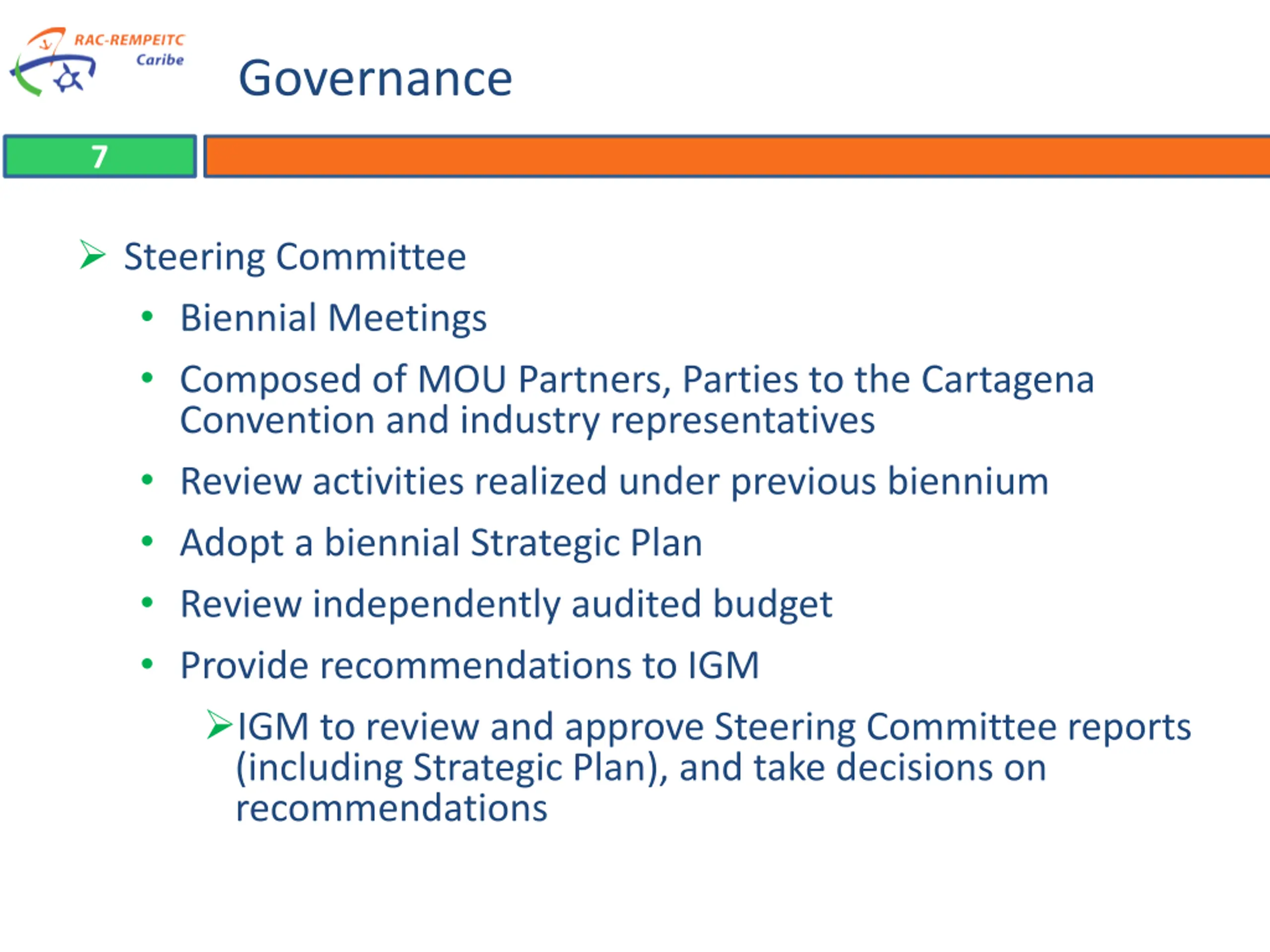 Governance 7 Steering Committee Biennial Meetings Composed of MOU Partners, Parties to the Cartagena Convention and industry representatives Review activities realized under previous biennium Adopt a biennial Strategic Plan Review independently audited budget Provide recommendations to IGM IGM to review and approve Steering Committee reports (including Strategic Plan), and take decisions on recommendations