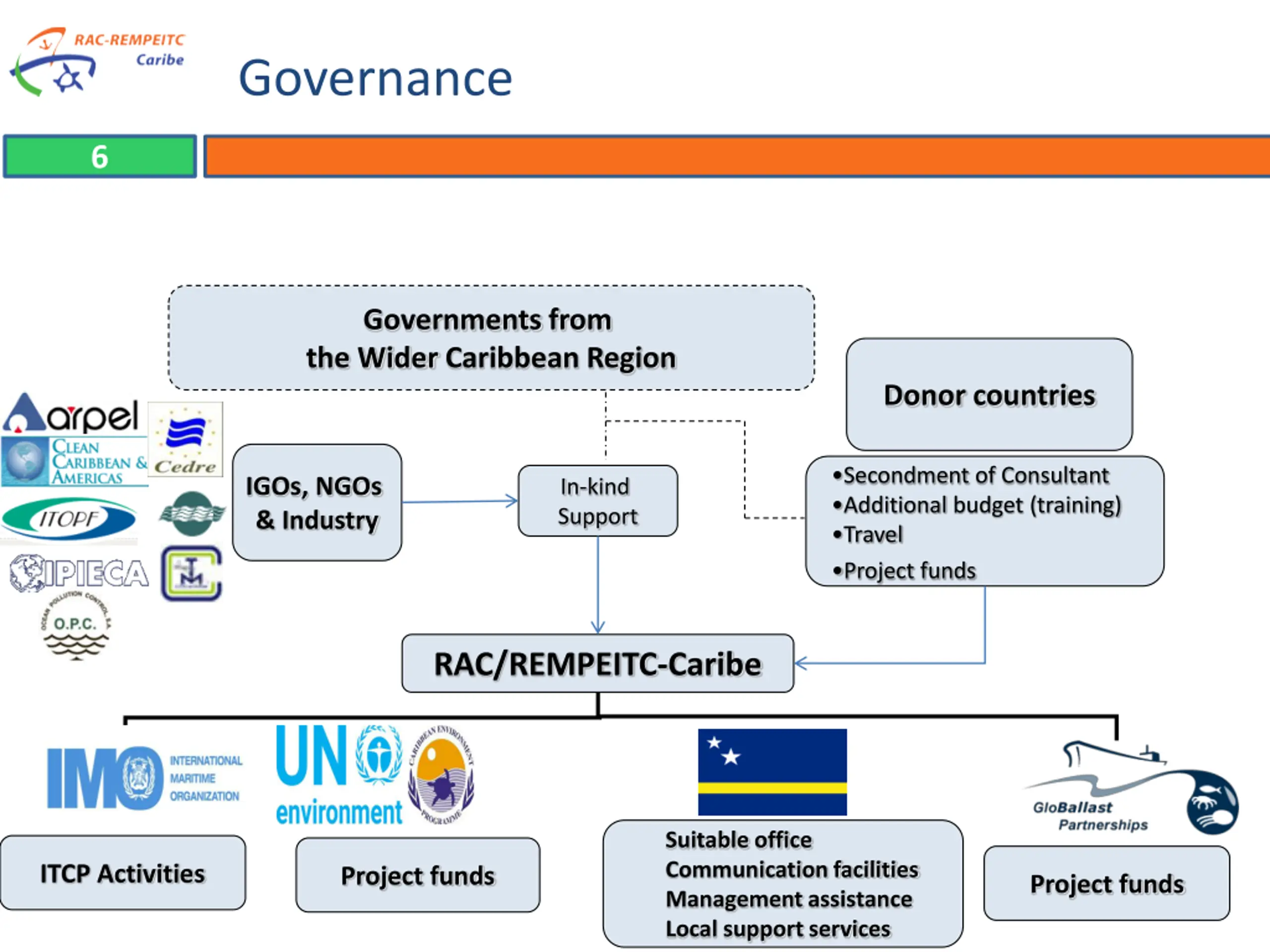 Governance 6 Governments from the Wider Caribbean Region Donor countries Secondment of Consultant Additional budget (training) Travel Project funds IGOs, NGOs & Industry In-kind Support RAC/REMPEITC-Caribe Suitable office Communication facilities Management assistance Local support services ITCP Activities Project funds Project funds 6