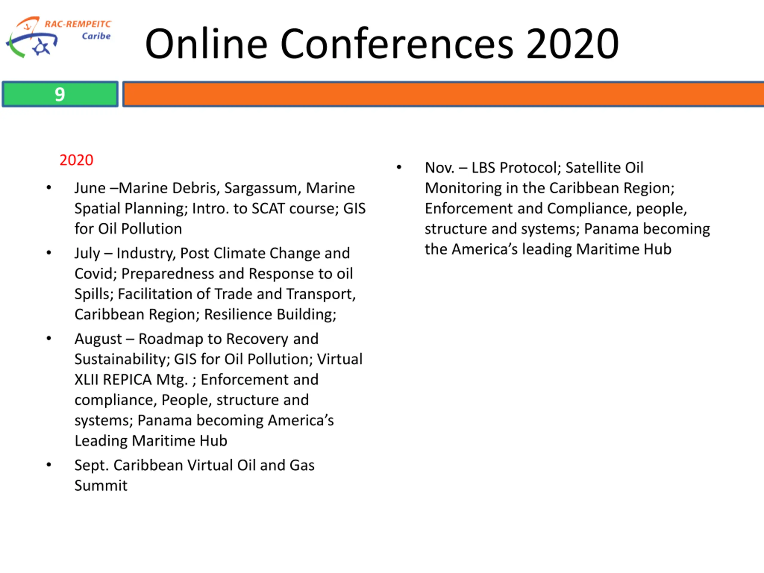 Online Conferences 2020 9 2020 Nov. LBS Protocol; Satellite Oil Monitoring in the Caribbean Region; Enforcement and Compliance, people, structure and systems; Panama becoming the America s leading Maritime Hub June Marine Debris, Sargassum, Marine Spatial Planning; Intro. to SCAT course; GIS for Oil Pollution July Industry, Post Climate Change and Covid; Preparedness and Response to oil Spills; Facilitation of Trade and Transport, Caribbean Region; Resilience Building; August Roadmap to Recovery and Sustainability; GIS for Oil Pollution; Virtual XLII REPICA Mtg. ; Enforcement and compliance, People, structure and systems; Panama becoming America s Leading Maritime Hub Sept. Caribbean Virtual Oil and Gas Summit