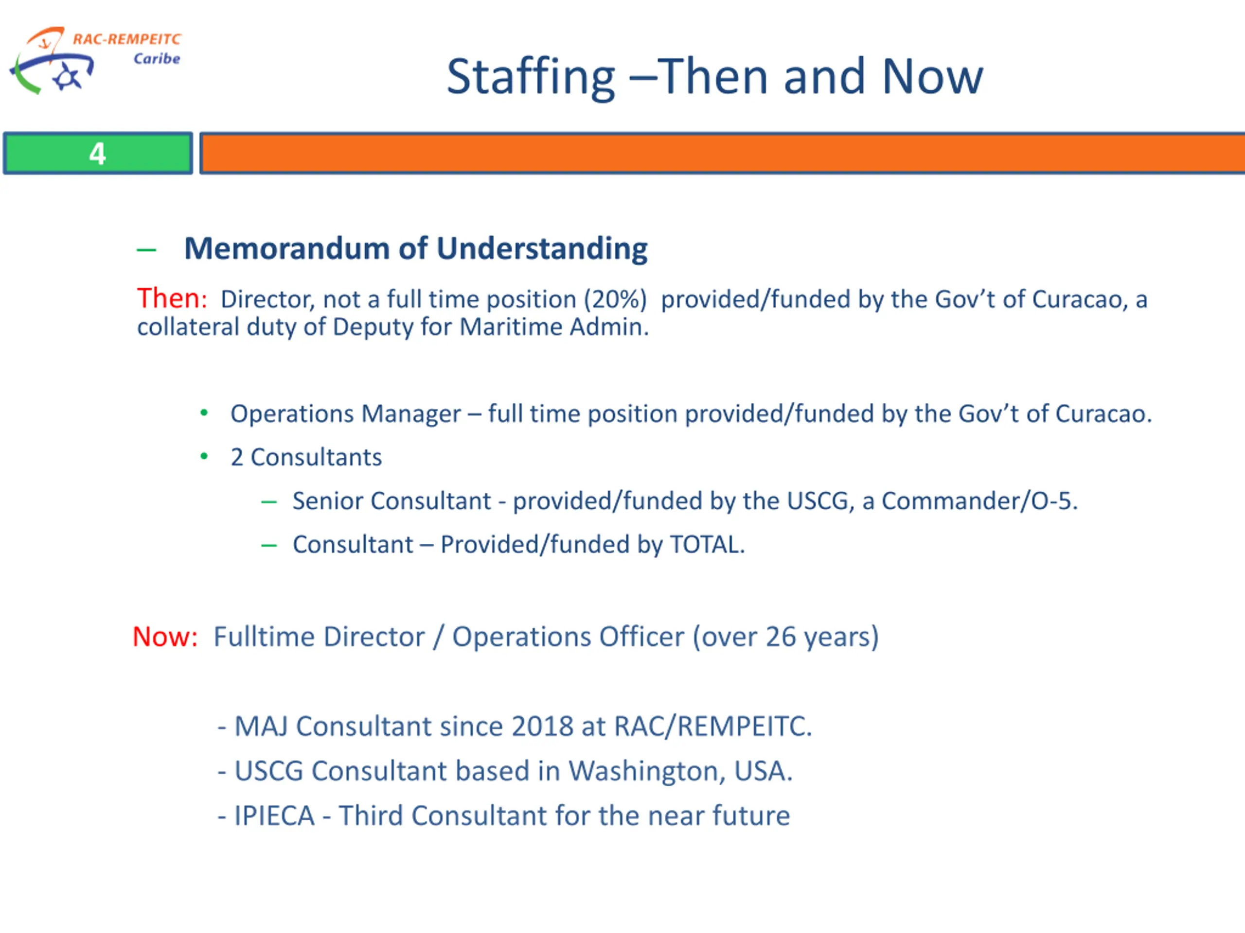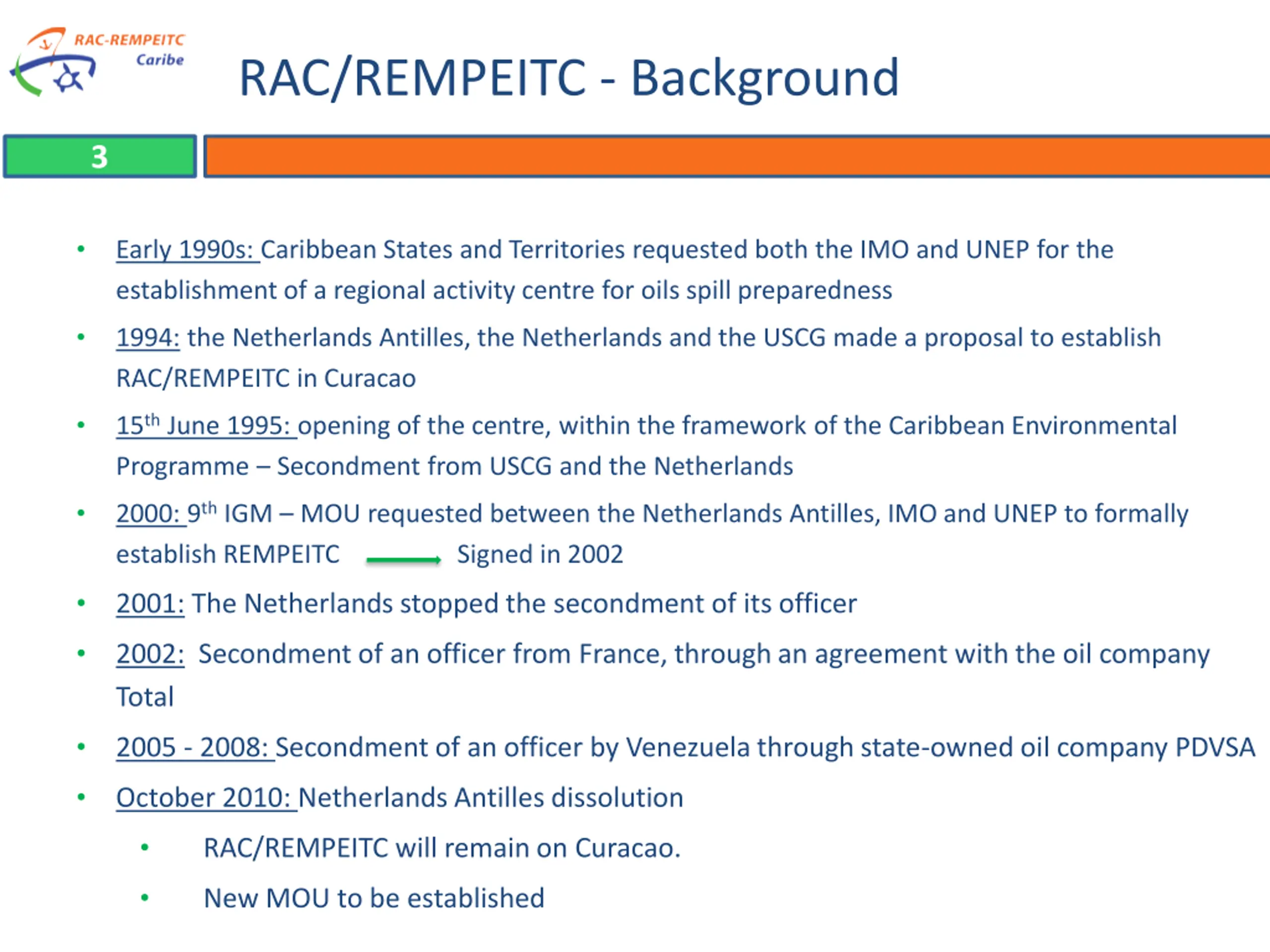 RAC/REMPEITC - Background 3 Early 1990s: Caribbean States and Territories requested both the IMO and UNEP for the establishment of a regional activity centre for oils spill preparedness 1994: the Netherlands Antilles, the Netherlands and the USCG made a proposal to establish RAC/REMPEITC in Curacao 15th June 1995: opening of the centre, within the framework of the Caribbean Environmental Programme Secondment from USCG and the Netherlands 2000: 9th IGM MOU requested between the Netherlands Antilles, IMO and UNEP to formally establish REMPEITC Signed in 2002 2001: The Netherlands stopped the secondment of its officer 2002: Secondment of an officer from France, through an agreement with the oil company Total 2005 - 2008: Secondment of an officer by Venezuela through state-owned oil company PDVSA October 2010: Netherlands Antilles dissolution RAC/REMPEITC will remain on Curacao. New MOU to be established