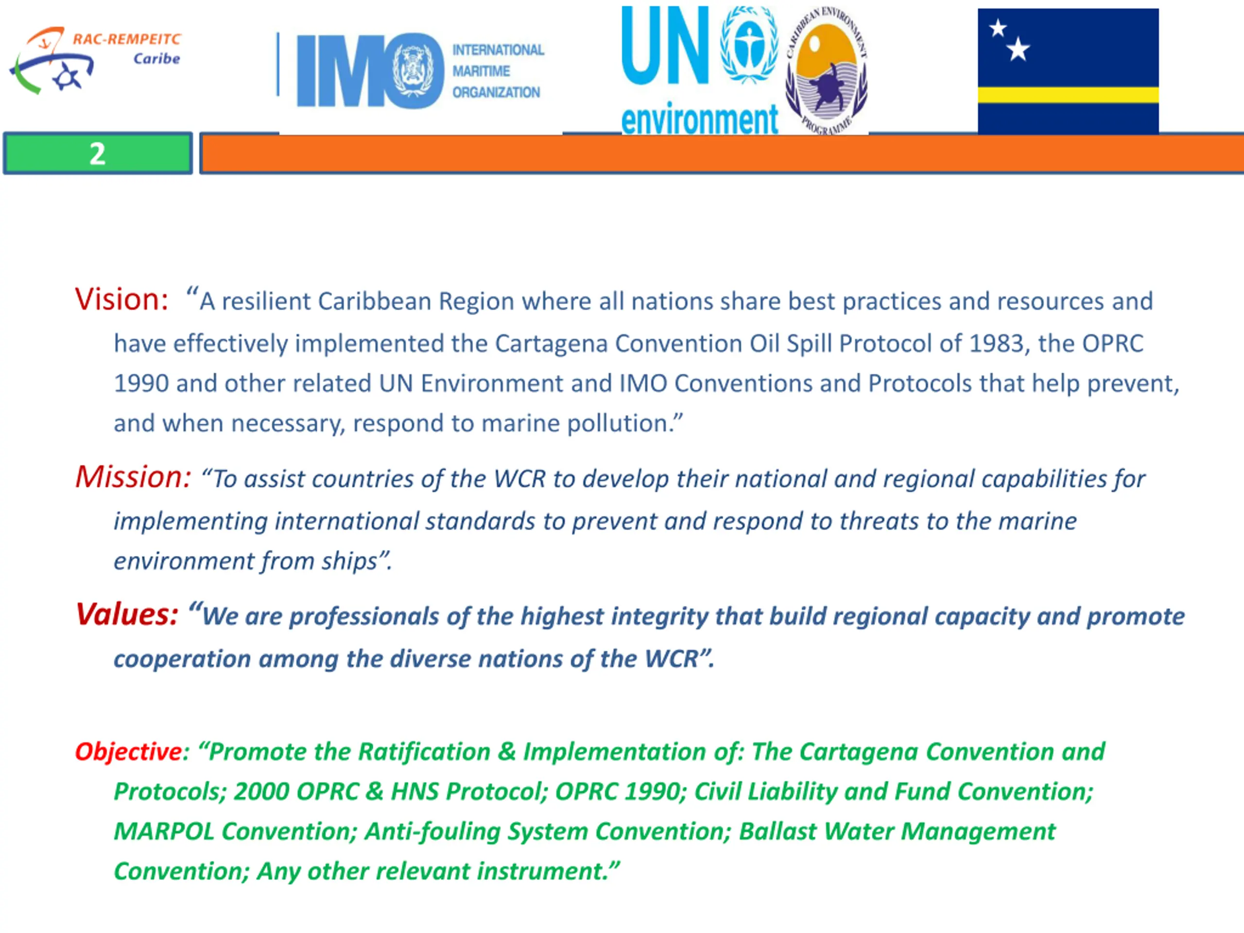2 Vision: A resilient Caribbean Region where all nations share best practices and resources and have effectively implemented the Cartagena Convention Oil Spill Protocol of 1983, the OPRC 1990 and other related UN Environment and IMO Conventions and Protocols that help prevent, and when necessary, respond to marine pollution. Mission: To assist countries of the WCR to develop their national and regional capabilities for implementing international standards to prevent and respond to threats to the marine environment from ships . Values: We are professionals of the highest integrity that build regional capacity and promote cooperation among the diverse nations of the WCR . Objective: Promote the Ratification & Implementation of: The Cartagena Convention and Protocols; 2000 OPRC & HNS Protocol; OPRC 1990; Civil Liability and Fund Convention; MARPOL Convention; Anti-fouling System Convention; Ballast Water Management Convention; Any other relevant instrument.