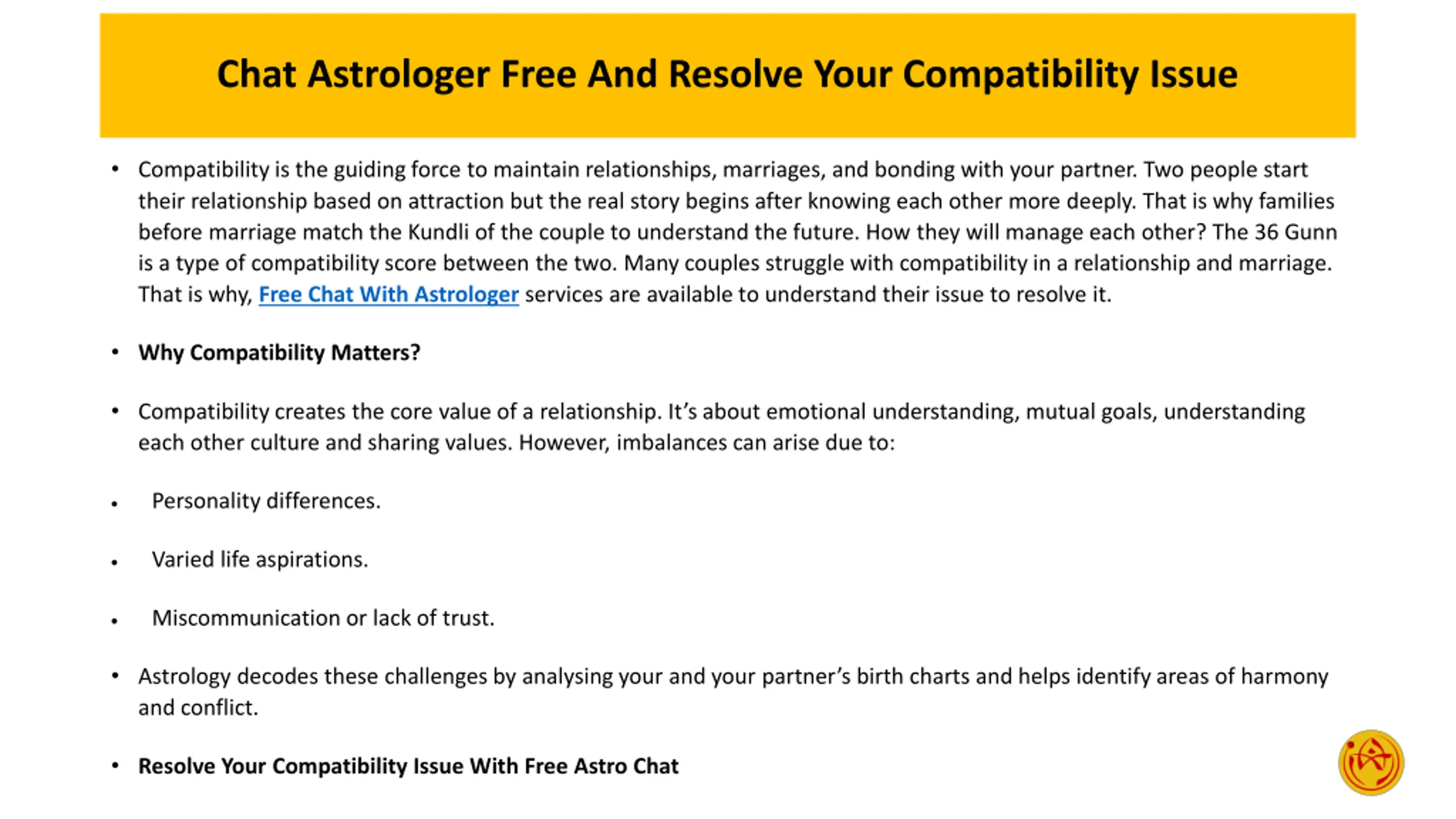 Chat Astrologer Free And Resolve Your Compatibility Issue Compatibility is the guiding force to maintain relationships, marriages, and bonding with your partner. Two people start their relationship based on attraction but the real story begins after knowing each other more deeply. That is why families before marriage match the Kundli of the couple to understand the future. How they will manage each other? The 36 Gunn is a type of compatibility score between the two. Many couples struggle with compatibility in a relationship and marriage. That is why, Free Chat With Astrologer services are available to understand their issue to resolve it. Why Compatibility Matters? Compatibility creates the core value of a relationship. It s about emotional understanding, mutual goals, understanding each other culture and sharing values. However, imbalances can arise due to: Personality differences. Varied life aspirations. Miscommunication or lack of trust. Astrology decodes these challenges by analysing your and your partner s birth charts and helps identify areas of harmony and conflict. Resolve Your Compatibility Issue With Free Astro Chat