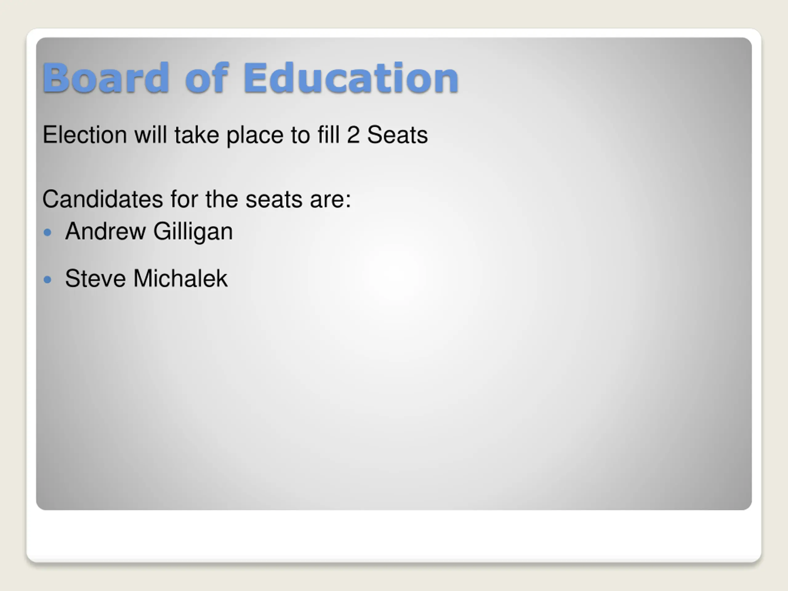 Board of Education Election will take place to fill 2 Seats Candidates for the seats are: Andrew Gilligan Steve Michalek