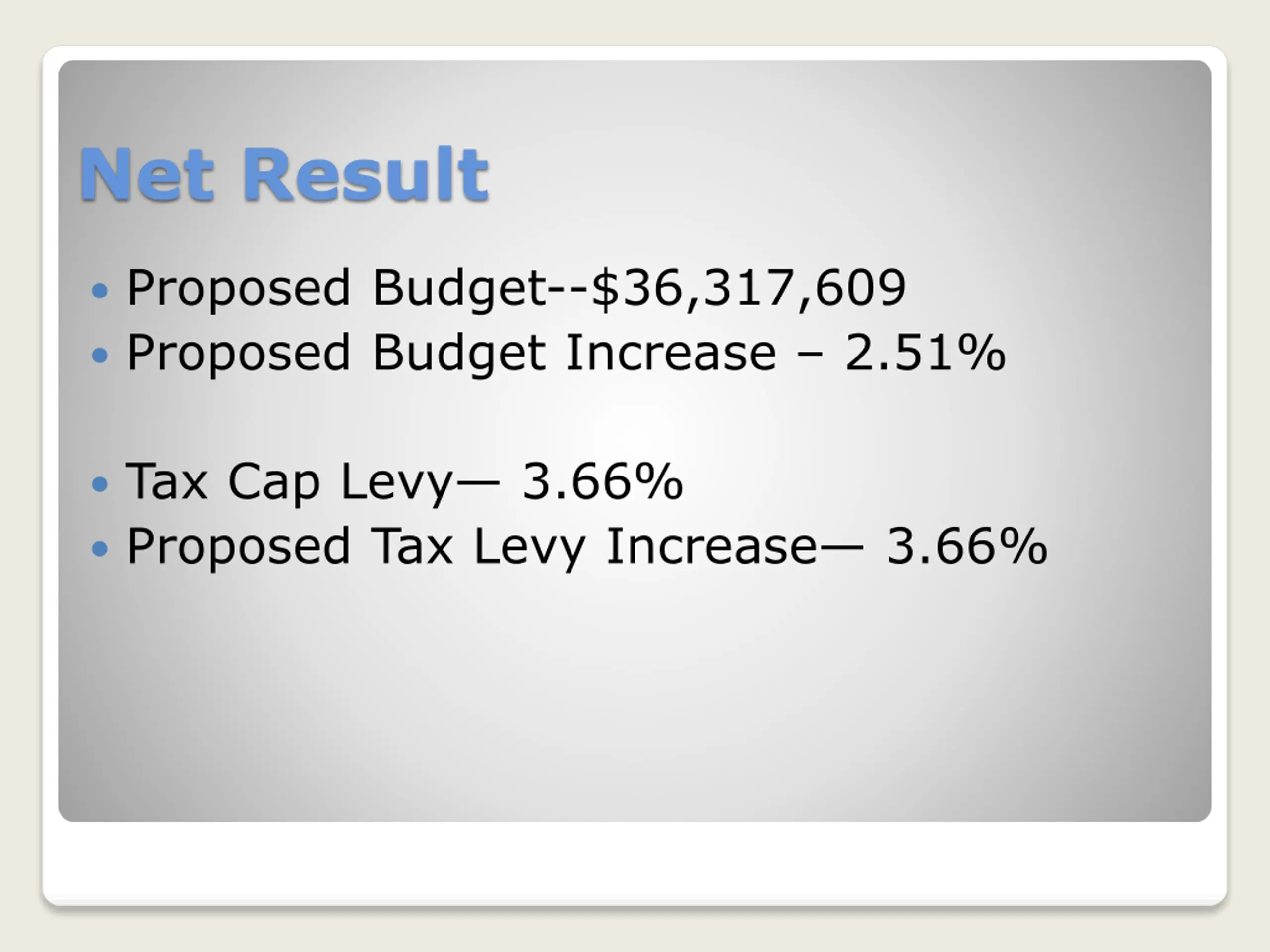 Net Result Proposed Budget--$36,317,609 Proposed Budget Increase 2.51% Tax Cap Levy 3.66% Proposed Tax Levy Increase 3.66%
