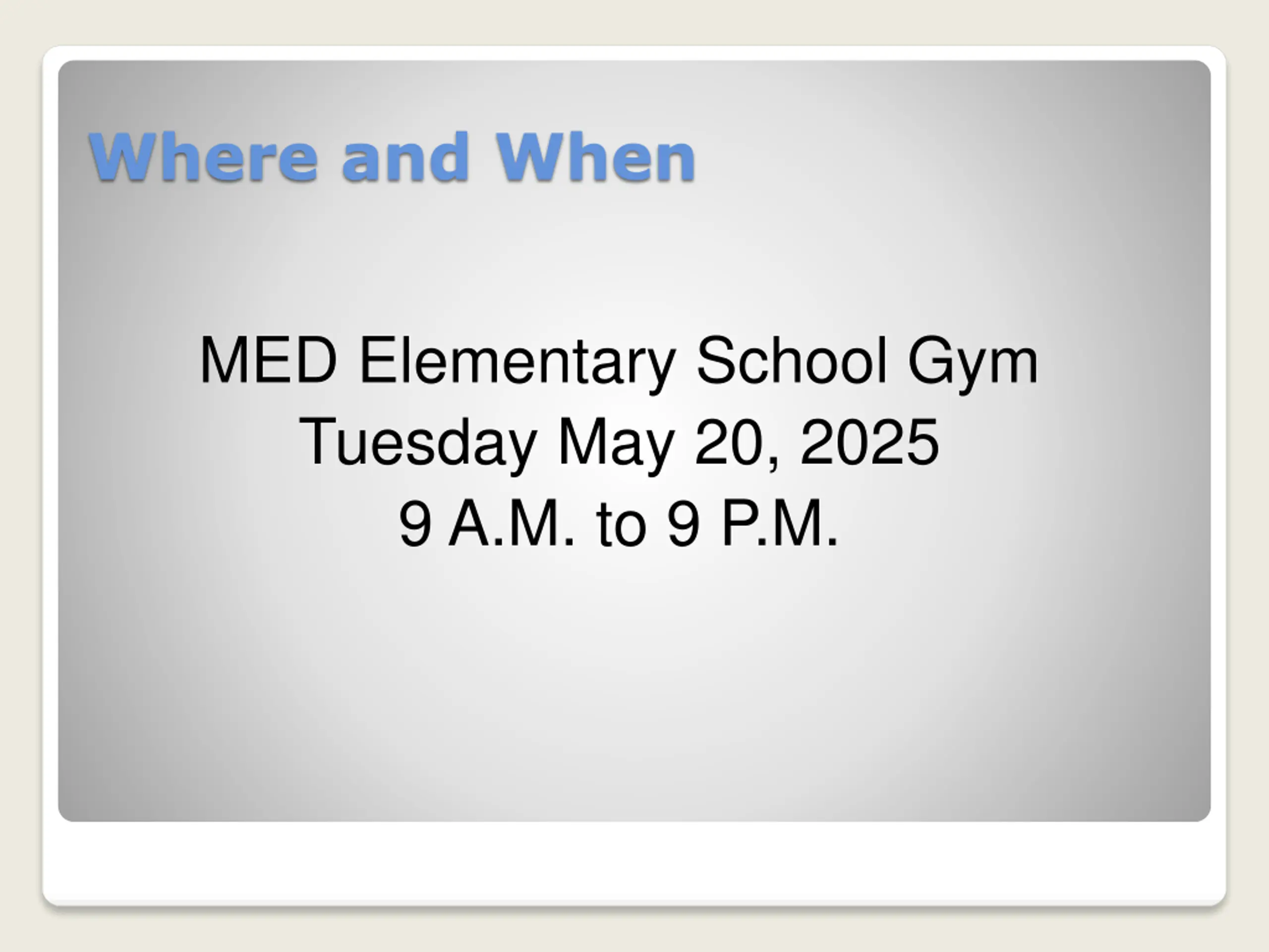 Where and When MED Elementary School Gym Tuesday May 20, 2025 9 A.M. to 9 P.M.