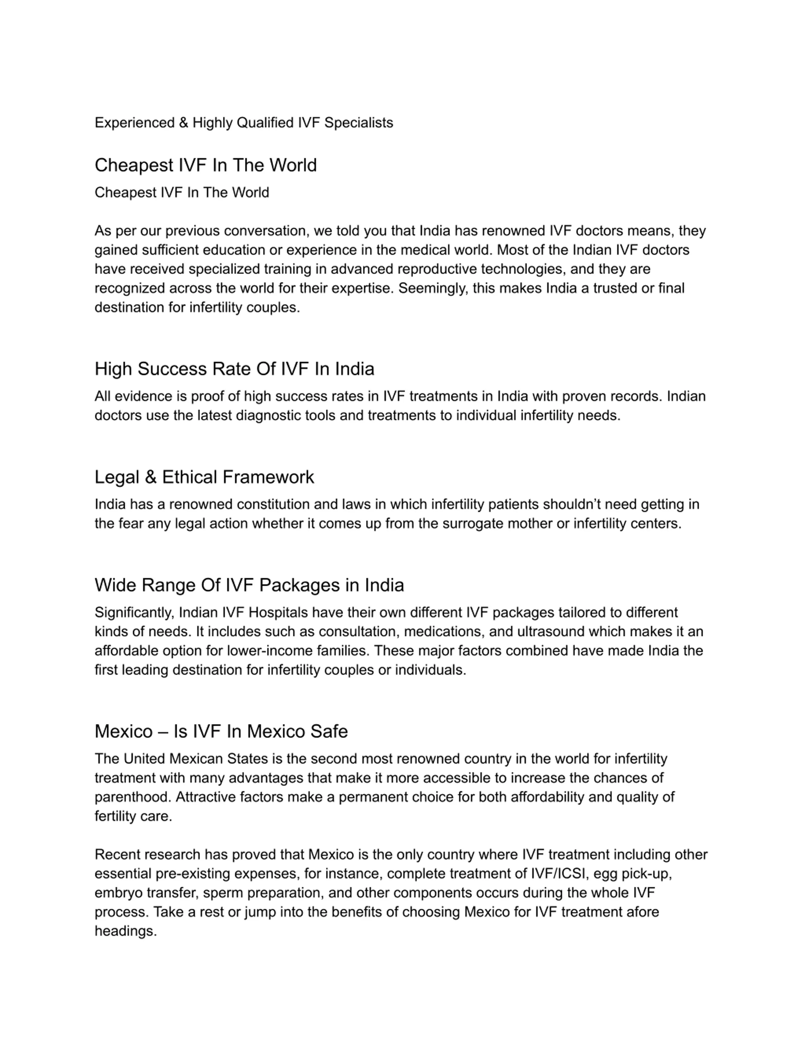 Experienced & Highly Qualified IVF Specialists Cheapest IVF In The World Cheapest IVF In The World As per our previous conversation, we told you that India has renowned IVF doctors means, they gained sufficient education or experience in the medical world. Most of the Indian IVF doctors have received specialized training in advanced reproductive technologies, and they are recognized across the world for their expertise. Seemingly, this makes India a trusted or final destination for infertility couples. High Success Rate Of IVF In India All evidence is proof of high success rates in IVF treatments in India with proven records. Indian doctors use the latest diagnostic tools and treatments to individual infertility needs. Legal & Ethical Framework India has a renowned constitution and laws in which infertility patients shouldn t need getting in the fear any legal action whether it comes up from the surrogate mother or infertility centers. Wide Range Of IVF Packages in India Significantly, Indian IVF Hospitals have their own different IVF packages tailored to different kinds of needs. It includes such as consultation, medications, and ultrasound which makes it an affordable option for lower-income families. These major factors combined have made India the first leading destination for infertility couples or individuals. Mexico Is IVF In Mexico Safe The United Mexican States is the second most renowned country in the world for infertility treatment with many advantages that make it more accessible to increase the chances of parenthood. Attractive factors make a permanent choice for both affordability and quality of fertility care. Recent research has proved that Mexico is the only country where IVF treatment including other essential pre-existing expenses, for instance, complete treatment of IVF/ICSI, egg pick-up, embryo transfer, sperm preparation, and other components occurs during the whole IVF process. Take a rest or jump into the benefits of choosing Mexico for IVF treatment afore headings.
