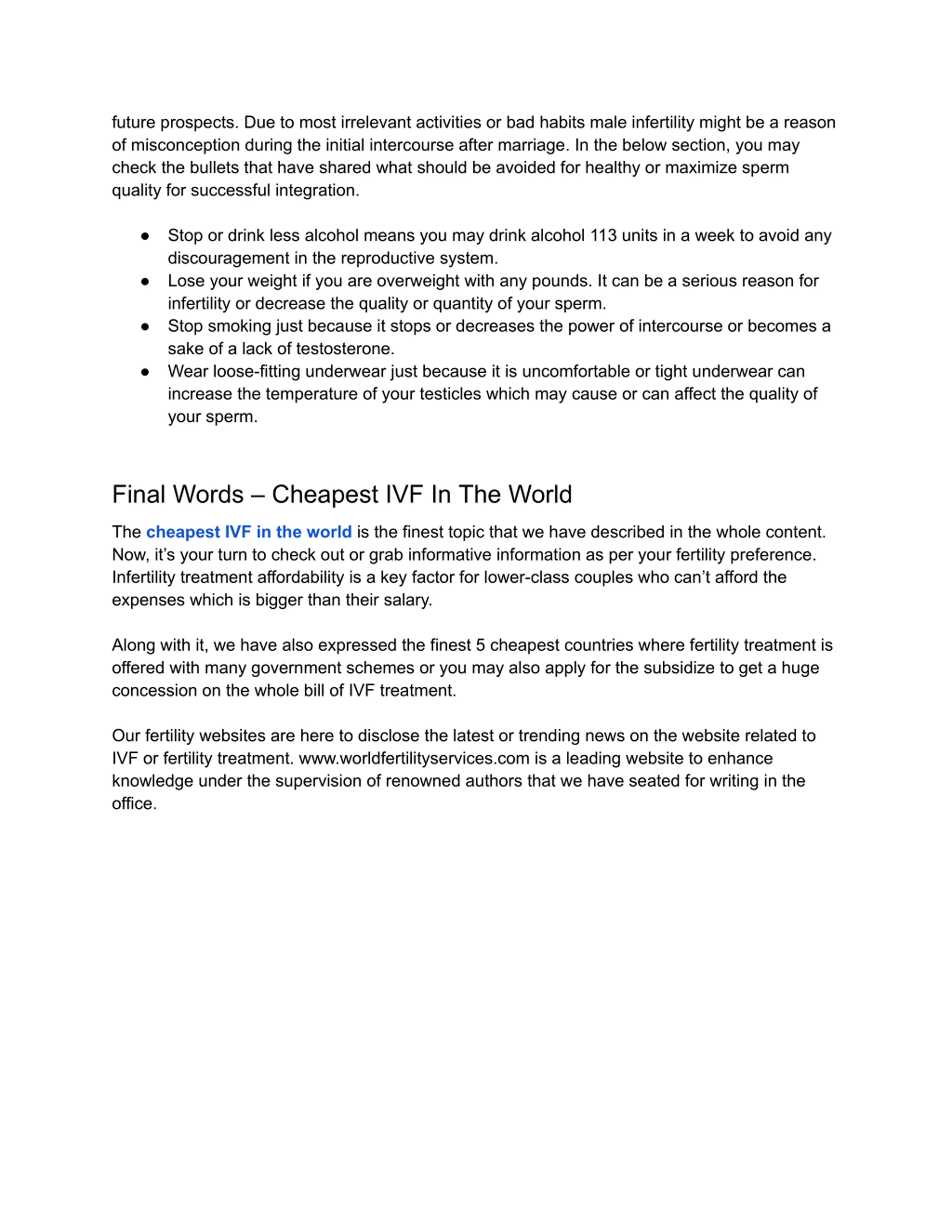 future prospects. Due to most irrelevant activities or bad habits male infertility might be a reason of misconception during the initial intercourse after marriage. In the below section, you may check the bullets that have shared what should be avoided for healthy or maximize sperm quality for successful integration. Stop or drink less alcohol means you may drink alcohol 113 units in a week to avoid any discouragement in the reproductive system. Lose your weight if you are overweight with any pounds. It can be a serious reason for infertility or decrease the quality or quantity of your sperm. Stop smoking just because it stops or decreases the power of intercourse or becomes a sake of a lack of testosterone. Wear loose-fitting underwear just because it is uncomfortable or tight underwear can increase the temperature of your testicles which may cause or can affect the quality of your sperm. Final Words Cheapest IVF In The World The cheapest IVF in the world is the finest topic that we have described in the whole content. Now, it s your turn to check out or grab informative information as per your fertility preference. Infertility treatment affordability is a key factor for lower-class couples who can t afford the expenses which is bigger than their salary. Along with it, we have also expressed the finest 5 cheapest countries where fertility treatment is offered with many government schemes or you may also apply for the subsidize to get a huge concession on the whole bill of IVF treatment. Our fertility websites are here to disclose the latest or trending news on the website related to IVF or fertility treatment. www.worldfertilityservices.com is a leading website to enhance knowledge under the supervision of renowned authors that we have seated for writing in the office.
