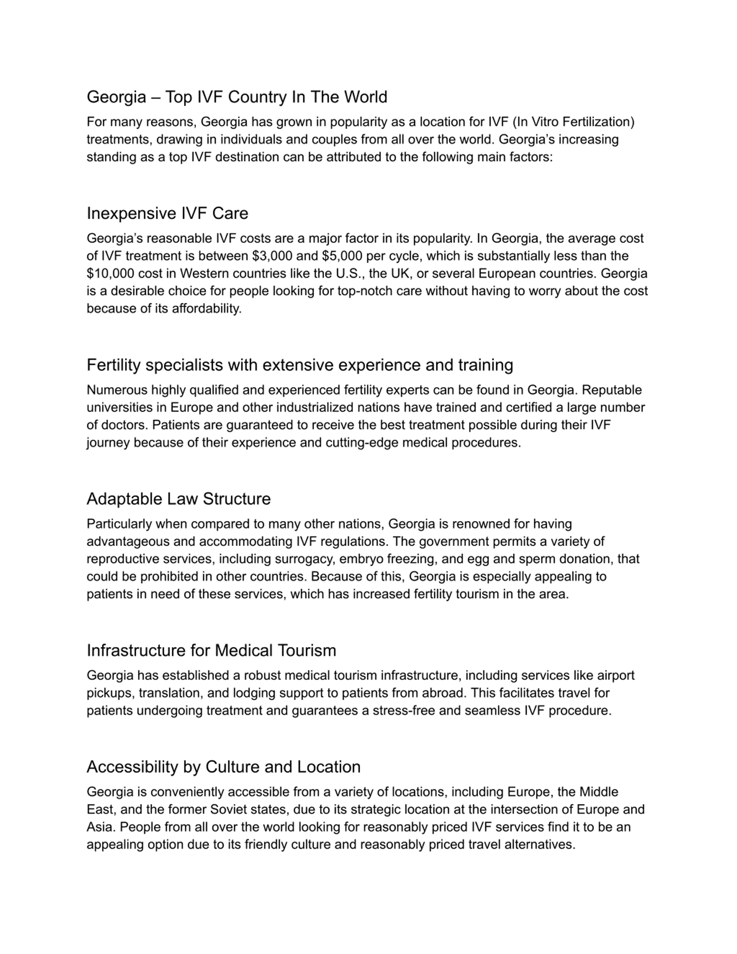 Georgia Top IVF Country In The World For many reasons, Georgia has grown in popularity as a location for IVF (In Vitro Fertilization) treatments, drawing in individuals and couples from all over the world. Georgia s increasing standing as a top IVF destination can be attributed to the following main factors: Inexpensive IVF Care Georgia s reasonable IVF costs are a major factor in its popularity. In Georgia, the average cost of IVF treatment is between $3,000 and $5,000 per cycle, which is substantially less than the $10,000 cost in Western countries like the U.S., the UK, or several European countries. Georgia is a desirable choice for people looking for top-notch care without having to worry about the cost because of its affordability. Fertility specialists with extensive experience and training Numerous highly qualified and experienced fertility experts can be found in Georgia. Reputable universities in Europe and other industrialized nations have trained and certified a large number of doctors. Patients are guaranteed to receive the best treatment possible during their IVF journey because of their experience and cutting-edge medical procedures. Adaptable Law Structure Particularly when compared to many other nations, Georgia is renowned for having advantageous and accommodating IVF regulations. The government permits a variety of reproductive services, including surrogacy, embryo freezing, and egg and sperm donation, that could be prohibited in other countries. Because of this, Georgia is especially appealing to patients in need of these services, which has increased fertility tourism in the area. Infrastructure for Medical Tourism Georgia has established a robust medical tourism infrastructure, including services like airport pickups, translation, and lodging support to patients from abroad. This facilitates travel for patients undergoing treatment and guarantees a stress-free and seamless IVF procedure. Accessibility by Culture and Location Georgia is conveniently accessible from a variety of locations, including Europe, the Middle East, and the former Soviet states, due to its strategic location at the intersection of Europe and Asia. People from all over the world looking for reasonably priced IVF services find it to be an appealing option due to its friendly culture and reasonably priced travel alternatives.