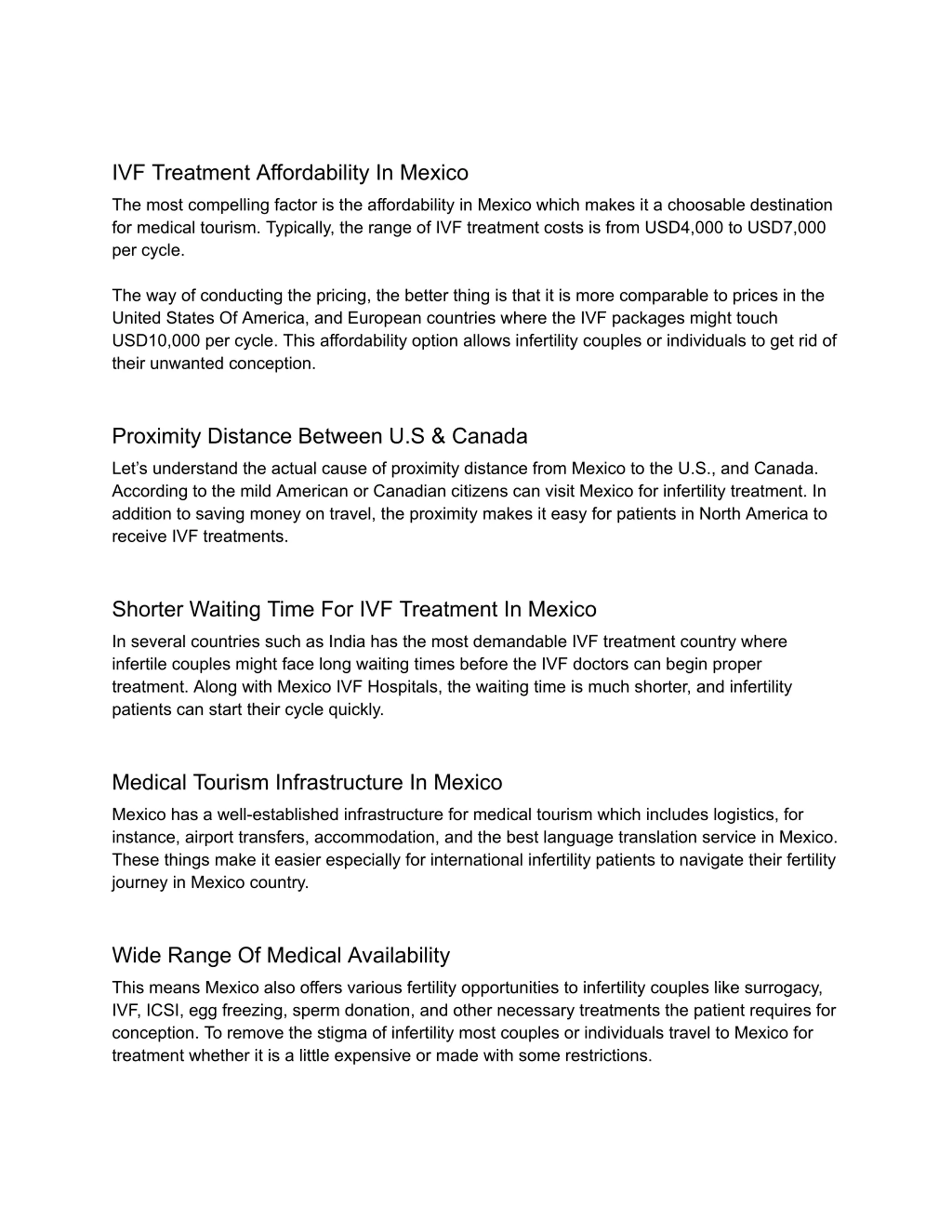 IVF Treatment Affordability In Mexico The most compelling factor is the affordability in Mexico which makes it a choosable destination for medical tourism. Typically, the range of IVF treatment costs is from USD4,000 to USD7,000 per cycle. The way of conducting the pricing, the better thing is that it is more comparable to prices in the United States Of America, and European countries where the IVF packages might touch USD10,000 per cycle. This affordability option allows infertility couples or individuals to get rid of their unwanted conception. Proximity Distance Between U.S & Canada Let s understand the actual cause of proximity distance from Mexico to the U.S., and Canada. According to the mild American or Canadian citizens can visit Mexico for infertility treatment. In addition to saving money on travel, the proximity makes it easy for patients in North America to receive IVF treatments. Shorter Waiting Time For IVF Treatment In Mexico In several countries such as India has the most demandable IVF treatment country where infertile couples might face long waiting times before the IVF doctors can begin proper treatment. Along with Mexico IVF Hospitals, the waiting time is much shorter, and infertility patients can start their cycle quickly. Medical Tourism Infrastructure In Mexico Mexico has a well-established infrastructure for medical tourism which includes logistics, for instance, airport transfers, accommodation, and the best language translation service in Mexico. These things make it easier especially for international infertility patients to navigate their fertility journey in Mexico country. Wide Range Of Medical Availability This means Mexico also offers various fertility opportunities to infertility couples like surrogacy, IVF, ICSI, egg freezing, sperm donation, and other necessary treatments the patient requires for conception. To remove the stigma of infertility most couples or individuals travel to Mexico for treatment whether it is a little expensive or made with some restrictions.