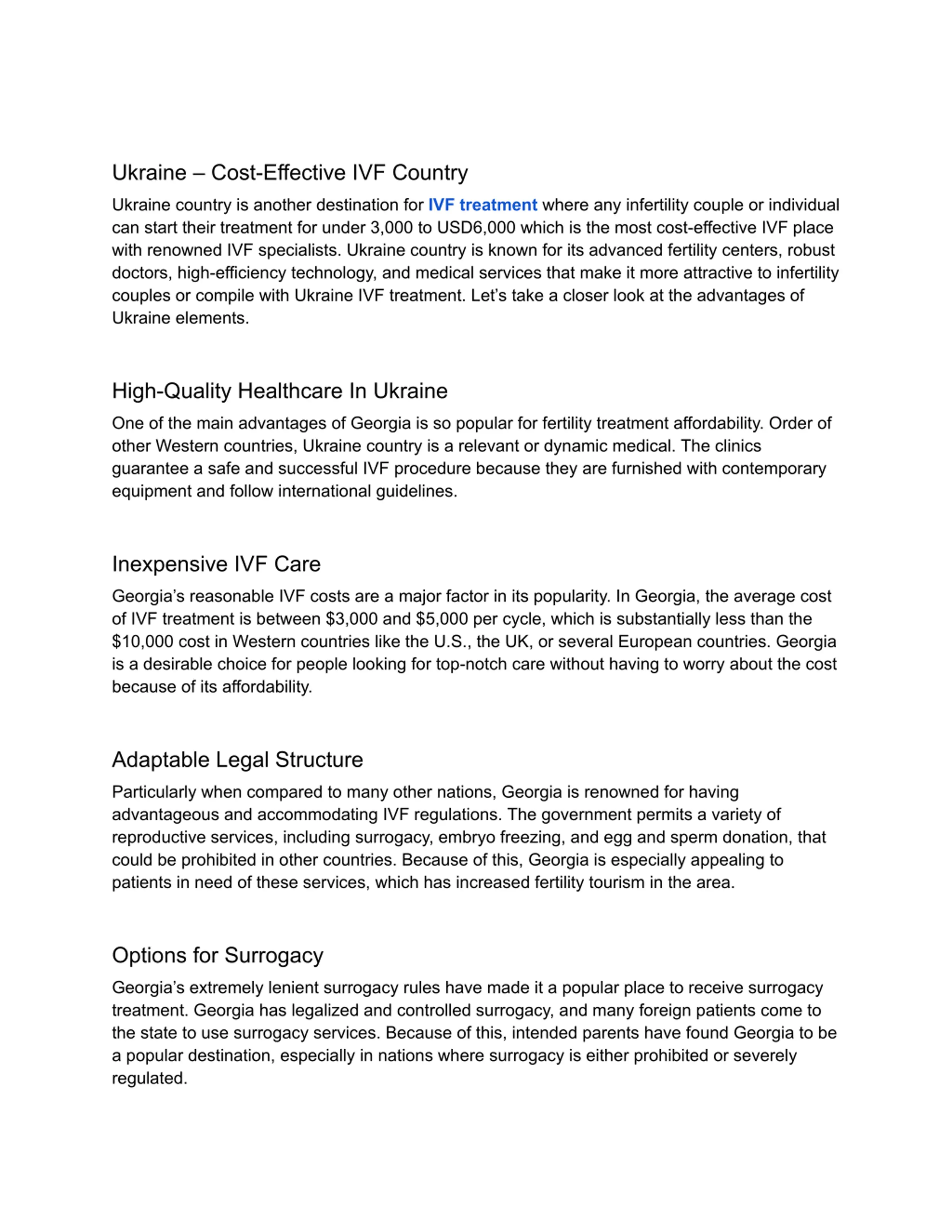 Ukraine Cost-Effective IVF Country Ukraine country is another destination for IVF treatment where any infertility couple or individual can start their treatment for under 3,000 to USD6,000 which is the most cost-effective IVF place with renowned IVF specialists. Ukraine country is known for its advanced fertility centers, robust doctors, high-efficiency technology, and medical services that make it more attractive to infertility couples or compile with Ukraine IVF treatment. Let s take a closer look at the advantages of Ukraine elements. High-Quality Healthcare In Ukraine One of the main advantages of Georgia is so popular for fertility treatment affordability. Order of other Western countries, Ukraine country is a relevant or dynamic medical. The clinics guarantee a safe and successful IVF procedure because they are furnished with contemporary equipment and follow international guidelines. Inexpensive IVF Care Georgia s reasonable IVF costs are a major factor in its popularity. In Georgia, the average cost of IVF treatment is between $3,000 and $5,000 per cycle, which is substantially less than the $10,000 cost in Western countries like the U.S., the UK, or several European countries. Georgia is a desirable choice for people looking for top-notch care without having to worry about the cost because of its affordability. Adaptable Legal Structure Particularly when compared to many other nations, Georgia is renowned for having advantageous and accommodating IVF regulations. The government permits a variety of reproductive services, including surrogacy, embryo freezing, and egg and sperm donation, that could be prohibited in other countries. Because of this, Georgia is especially appealing to patients in need of these services, which has increased fertility tourism in the area. Options for Surrogacy Georgia s extremely lenient surrogacy rules have made it a popular place to receive surrogacy treatment. Georgia has legalized and controlled surrogacy, and many foreign patients come to the state to use surrogacy services. Because of this, intended parents have found Georgia to be a popular destination, especially in nations where surrogacy is either prohibited or severely regulated.