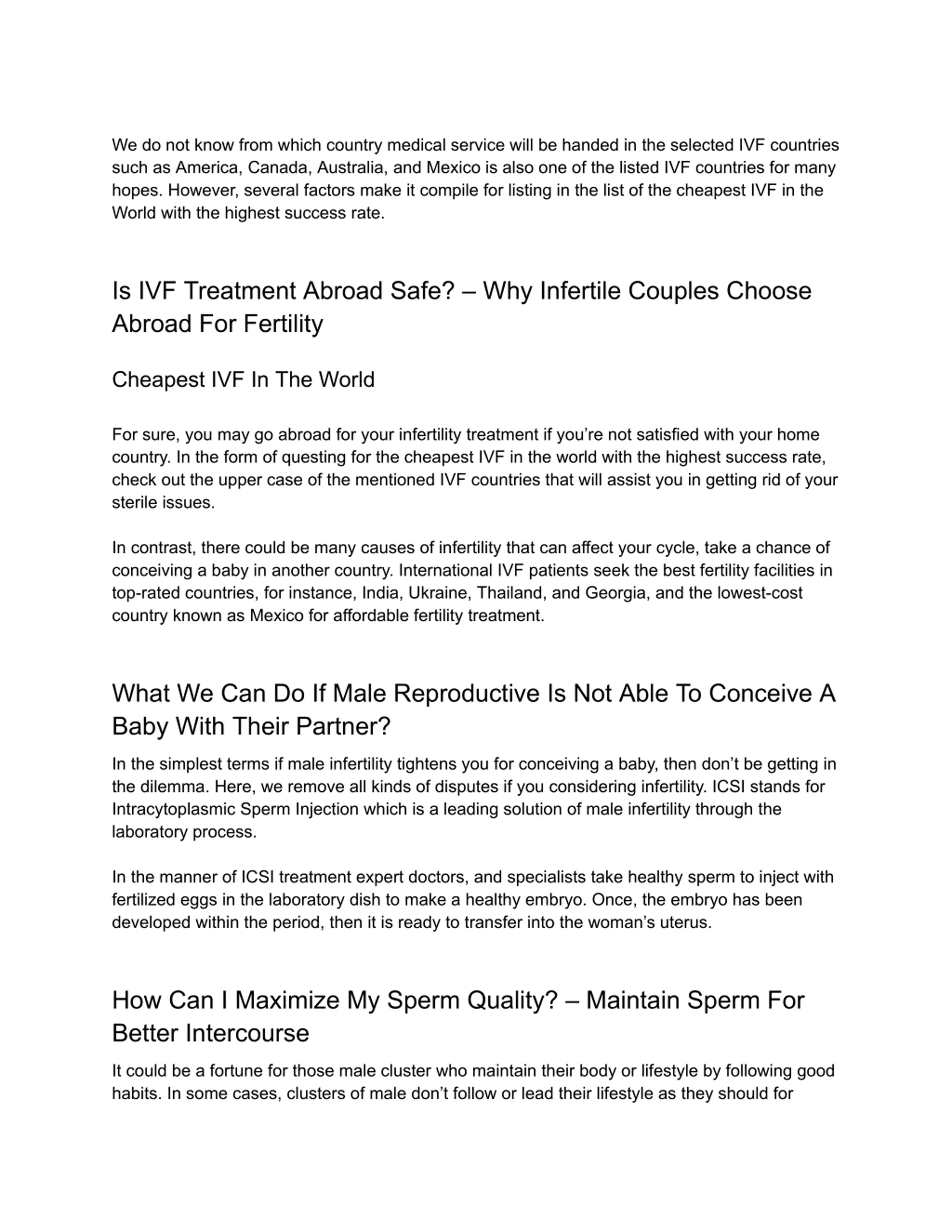 We do not know from which country medical service will be handed in the selected IVF countries such as America, Canada, Australia, and Mexico is also one of the listed IVF countries for many hopes. However, several factors make it compile for listing in the list of the cheapest IVF in the World with the highest success rate. Is IVF Treatment Abroad Safe? Why Infertile Couples Choose Abroad For Fertility Cheapest IVF In The World For sure, you may go abroad for your infertility treatment if you re not satisfied with your home country. In the form of questing for the cheapest IVF in the world with the highest success rate, check out the upper case of the mentioned IVF countries that will assist you in getting rid of your sterile issues. In contrast, there could be many causes of infertility that can affect your cycle, take a chance of conceiving a baby in another country. International IVF patients seek the best fertility facilities in top-rated countries, for instance, India, Ukraine, Thailand, and Georgia, and the lowest-cost country known as Mexico for affordable fertility treatment. What We Can Do If Male Reproductive Is Not Able To Conceive A Baby With Their Partner? In the simplest terms if male infertility tightens you for conceiving a baby, then don t be getting in the dilemma. Here, we remove all kinds of disputes if you considering infertility. ICSI stands for Intracytoplasmic Sperm Injection which is a leading solution of male infertility through the laboratory process. In the manner of ICSI treatment expert doctors, and specialists take healthy sperm to inject with fertilized eggs in the laboratory dish to make a healthy embryo. Once, the embryo has been developed within the period, then it is ready to transfer into the woman s uterus. How Can I Maximize My Sperm Quality? Maintain Sperm For Better Intercourse It could be a fortune for those male cluster who maintain their body or lifestyle by following good habits. In some cases, clusters of male don t follow or lead their lifestyle as they should for