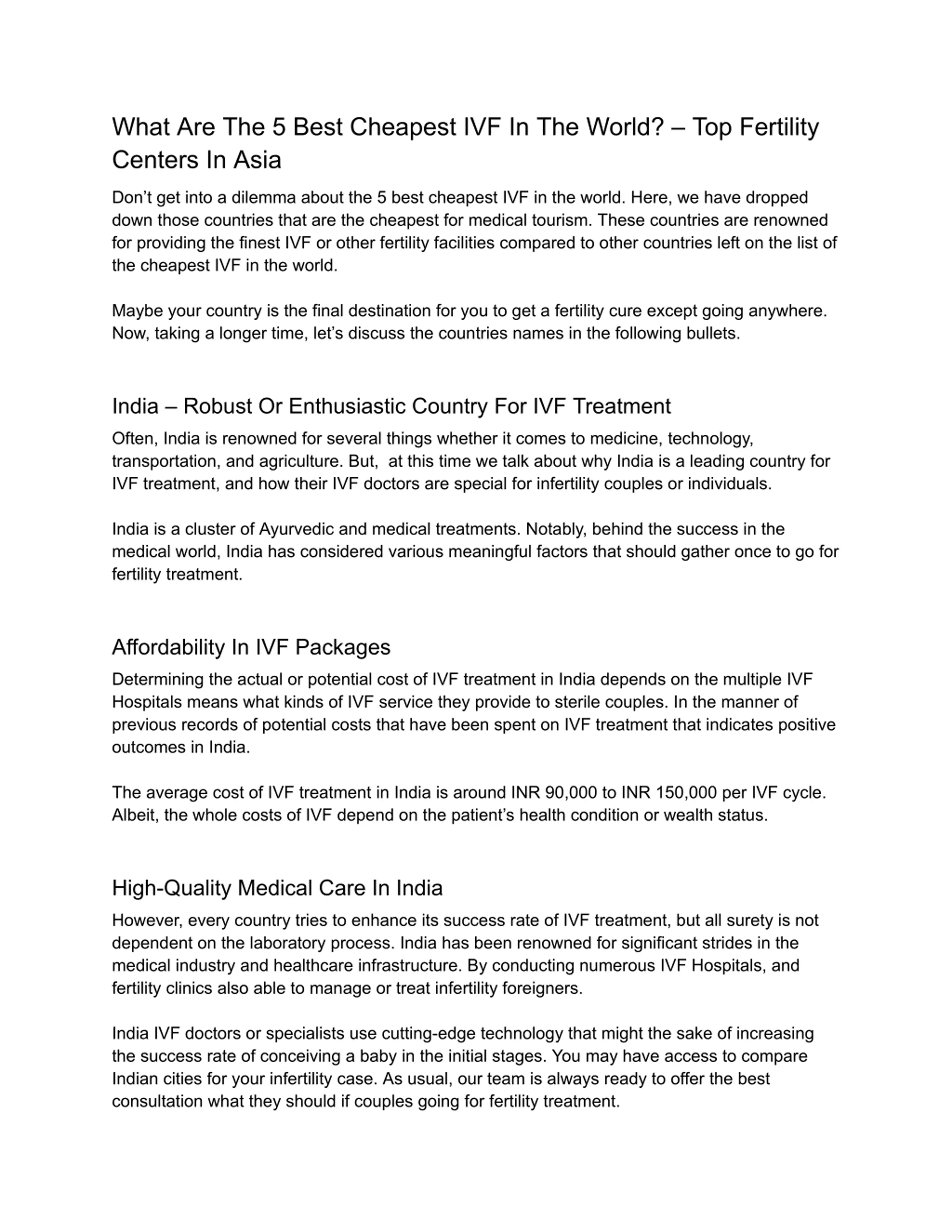 What Are The 5 Best Cheapest IVF In The World? Top Fertility Centers In Asia Don t get into a dilemma about the 5 best cheapest IVF in the world. Here, we have dropped down those countries that are the cheapest for medical tourism. These countries are renowned for providing the finest IVF or other fertility facilities compared to other countries left on the list of the cheapest IVF in the world. Maybe your country is the final destination for you to get a fertility cure except going anywhere. Now, taking a longer time, let s discuss the countries names in the following bullets. India Robust Or Enthusiastic Country For IVF Treatment Often, India is renowned for several things whether it comes to medicine, technology, transportation, and agriculture. But, at this time we talk about why India is a leading country for IVF treatment, and how their IVF doctors are special for infertility couples or individuals. India is a cluster of Ayurvedic and medical treatments. Notably, behind the success in the medical world, India has considered various meaningful factors that should gather once to go for fertility treatment. Affordability In IVF Packages Determining the actual or potential cost of IVF treatment in India depends on the multiple IVF Hospitals means what kinds of IVF service they provide to sterile couples. In the manner of previous records of potential costs that have been spent on IVF treatment that indicates positive outcomes in India. The average cost of IVF treatment in India is around INR 90,000 to INR 150,000 per IVF cycle. Albeit, the whole costs of IVF depend on the patient s health condition or wealth status. High-Quality Medical Care In India However, every country tries to enhance its success rate of IVF treatment, but all surety is not dependent on the laboratory process. India has been renowned for significant strides in the medical industry and healthcare infrastructure. By conducting numerous IVF Hospitals, and fertility clinics also able to manage or treat infertility foreigners. India IVF doctors or specialists use cutting-edge technology that might the sake of increasing the success rate of conceiving a baby in the initial stages. You may have access to compare Indian cities for your infertility case. As usual, our team is always ready to offer the best consultation what they should if couples going for fertility treatment.