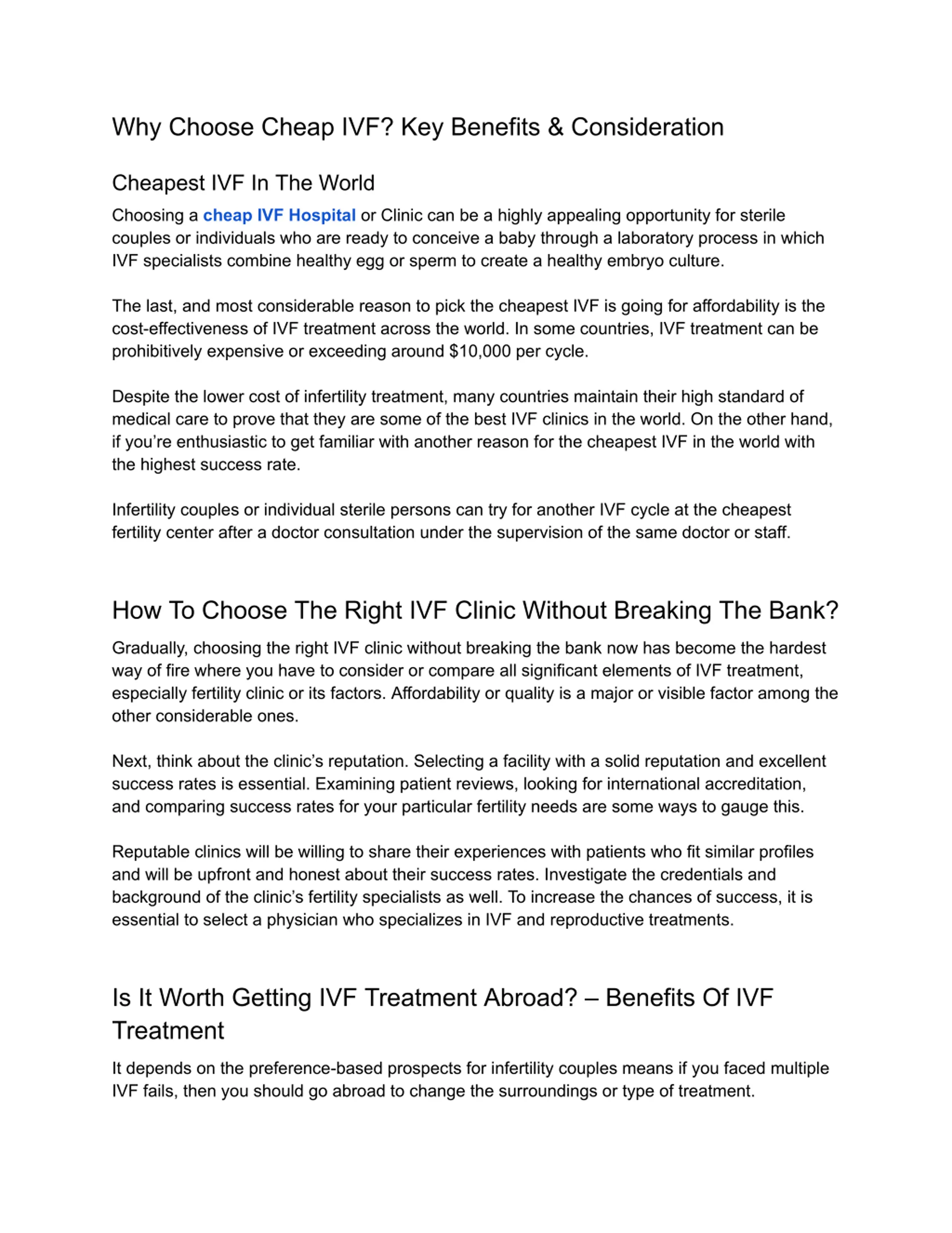 Why Choose Cheap IVF? Key Benefits & Consideration Cheapest IVF In The World Choosing a cheap IVF Hospital or Clinic can be a highly appealing opportunity for sterile couples or individuals who are ready to conceive a baby through a laboratory process in which IVF specialists combine healthy egg or sperm to create a healthy embryo culture. The last, and most considerable reason to pick the cheapest IVF is going for affordability is the cost-effectiveness of IVF treatment across the world. In some countries, IVF treatment can be prohibitively expensive or exceeding around $10,000 per cycle. Despite the lower cost of infertility treatment, many countries maintain their high standard of medical care to prove that they are some of the best IVF clinics in the world. On the other hand, if you re enthusiastic to get familiar with another reason for the cheapest IVF in the world with the highest success rate. Infertility couples or individual sterile persons can try for another IVF cycle at the cheapest fertility center after a doctor consultation under the supervision of the same doctor or staff. How To Choose The Right IVF Clinic Without Breaking The Bank? Gradually, choosing the right IVF clinic without breaking the bank now has become the hardest way of fire where you have to consider or compare all significant elements of IVF treatment, especially fertility clinic or its factors. Affordability or quality is a major or visible factor among the other considerable ones. Next, think about the clinic s reputation. Selecting a facility with a solid reputation and excellent success rates is essential. Examining patient reviews, looking for international accreditation, and comparing success rates for your particular fertility needs are some ways to gauge this. Reputable clinics will be willing to share their experiences with patients who fit similar profiles and will be upfront and honest about their success rates. Investigate the credentials and background of the clinic s fertility specialists as well. To increase the chances of success, it is essential to select a physician who specializes in IVF and reproductive treatments. Is It Worth Getting IVF Treatment Abroad? Benefits Of IVF Treatment It depends on the preference-based prospects for infertility couples means if you faced multiple IVF fails, then you should go abroad to change the surroundings or type of treatment.