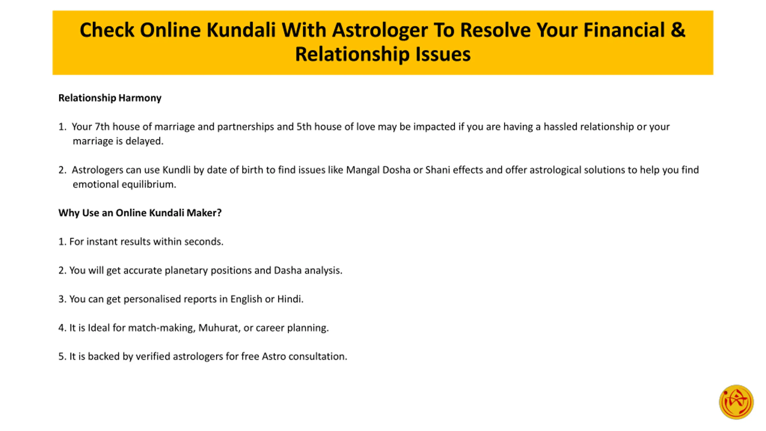 Check Online Kundali With Astrologer To Resolve Your Financial & Relationship Issues Relationship Harmony 1. Your 7th house of marriage and partnerships and 5th house of love may be impacted if you are having a hassled relationship or your marriage is delayed. 2. Astrologers can use Kundli by date of birth to find issues like Mangal Dosha or Shani effects and offer astrological solutions to help you find emotional equilibrium. Why Use an Online Kundali Maker? 1. For instant results within seconds. 2. You will get accurate planetary positions and Dasha analysis. 3. You can get personalised reports in English or Hindi. 4. It is Ideal for match-making, Muhurat, or career planning. 5. It is backed by verified astrologers for free Astro consultation.