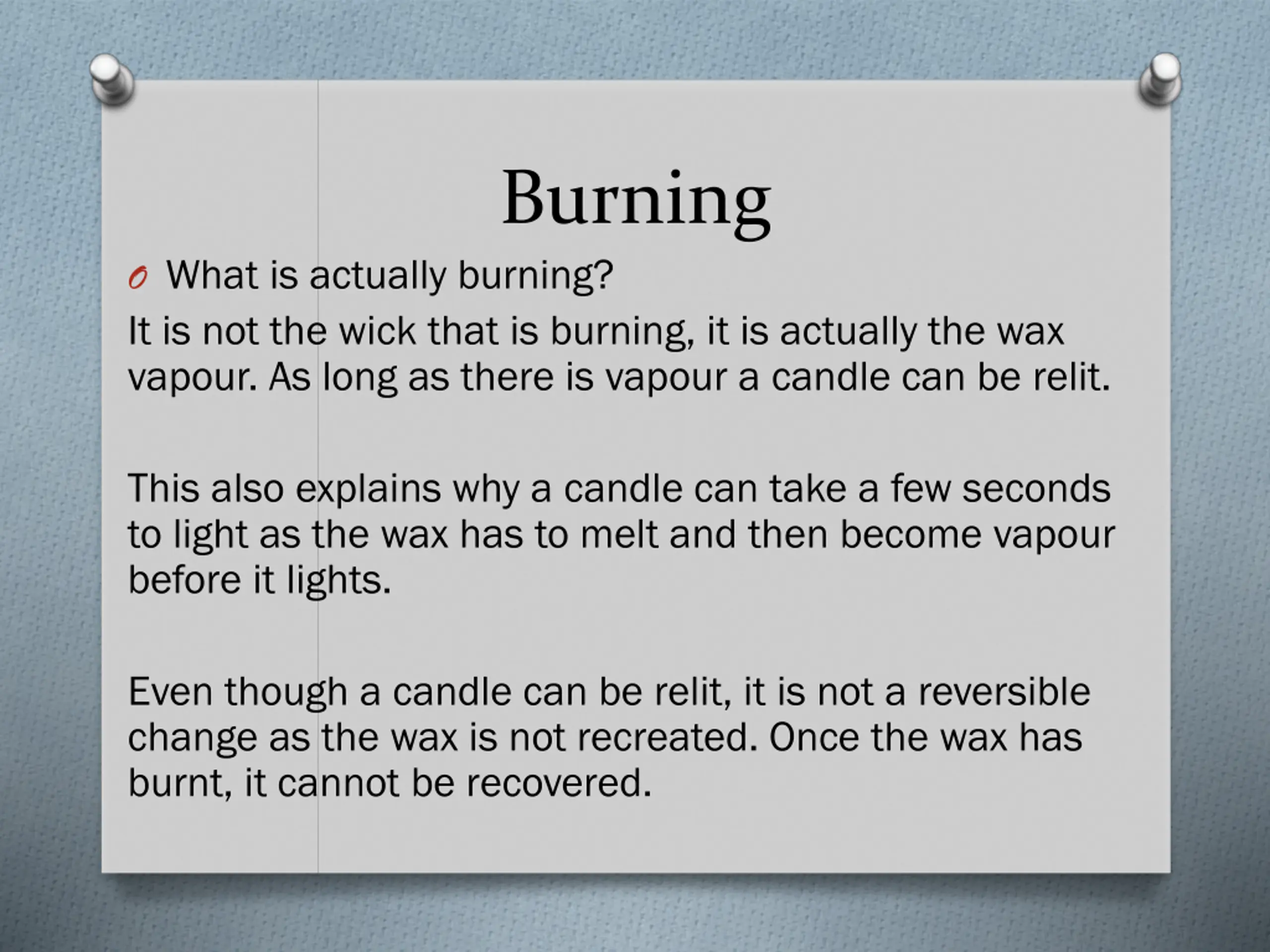 Burning O What is actually burning? It is not the wick that is burning, it is actually the wax vapour. As long as there is vapour a candle can be relit. This also explains why a candle can take a few seconds to light as the wax has to melt and then become vapour before it lights. Even though a candle can be relit, it is not a reversible change as the wax is not recreated. Once the wax has burnt, it cannot be recovered.