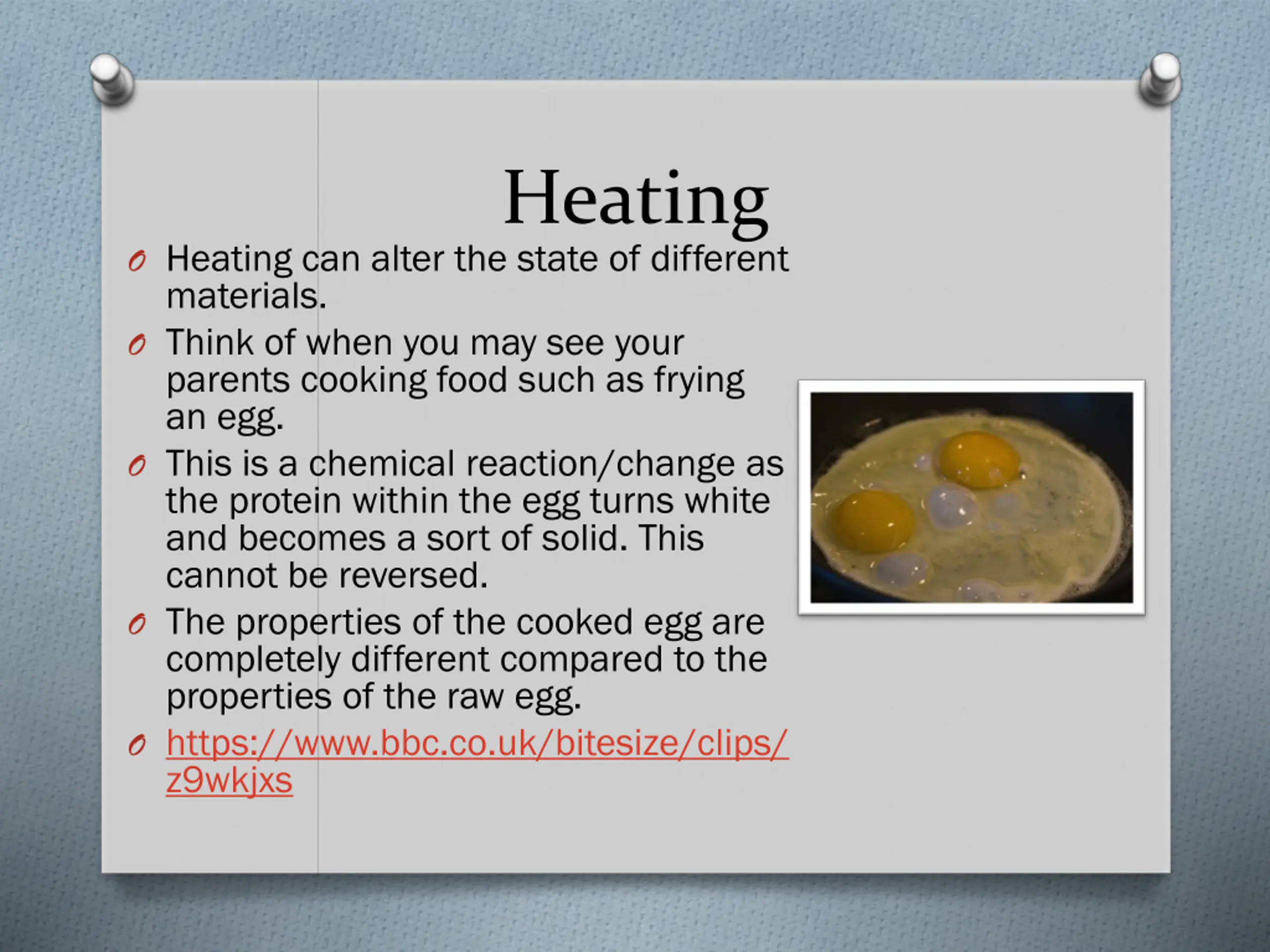 Heating O Heating can alter the state of different materials. O Think of when you may see your parents cooking food such as frying an egg. O This is a chemical reaction/change as the protein within the egg turns white and becomes a sort of solid. This cannot be reversed. O The properties of the cooked egg are completely different compared to the properties of the raw egg. O https://www.bbc.co.uk/bitesize/clips/ z9wkjxs