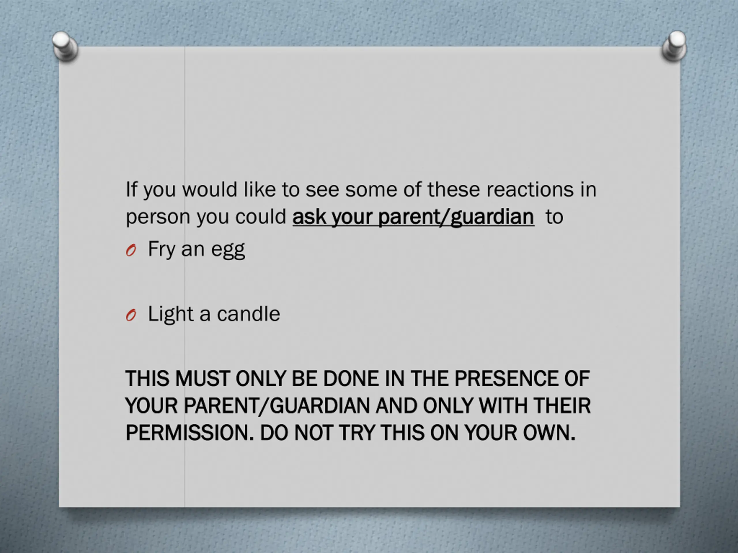 If you would like to see some of these reactions in person you could ask your parent/guardian ask your parent/guardian to O Fry an egg O Light a candle THIS MUST ONLY BE DONE IN THE PRESENCE OF THIS MUST ONLY BE DONE IN THE PRESENCE OF YOUR PARENT/GUARDIAN AND ONLY WITH THEIR YOUR PARENT/GUARDIAN AND ONLY WITH THEIR PERMISSION. DO NOT TRY THIS ON YOUR OWN. PERMISSION. DO NOT TRY THIS ON YOUR OWN.