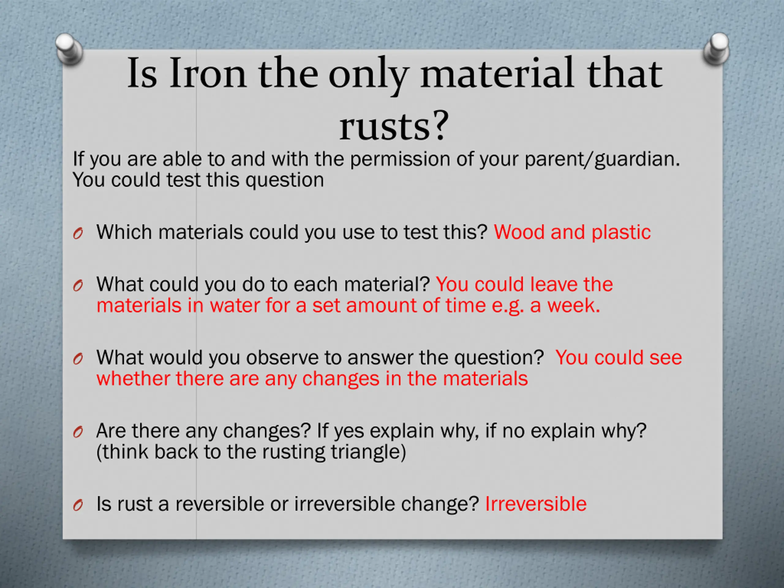 Is Iron the only material that rusts? If you are able to and with the permission of your parent/guardian. You could test this question O Which materials could you use to test this? Wood and plastic O What could you do to each material? You could leave the materials in water for a set amount of time e.g. a week. O What would you observe to answer the question? You could see whether there are any changes in the materials O Are there any changes? If yes explain why, if no explain why? (think back to the rusting triangle) O Is rust a reversible or irreversible change? Irreversible