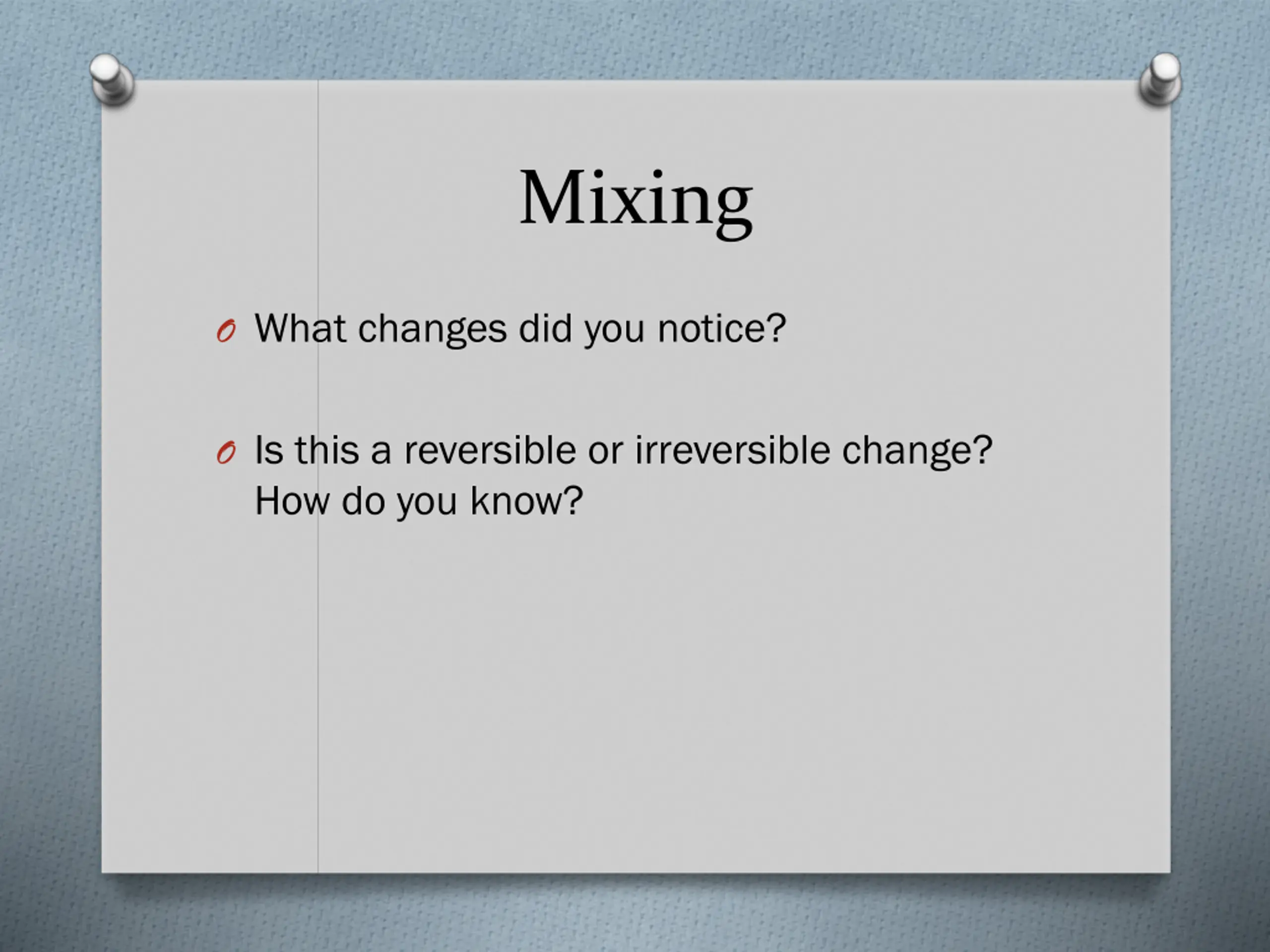 Mixing O What changes did you notice? O Is this a reversible or irreversible change? How do you know?