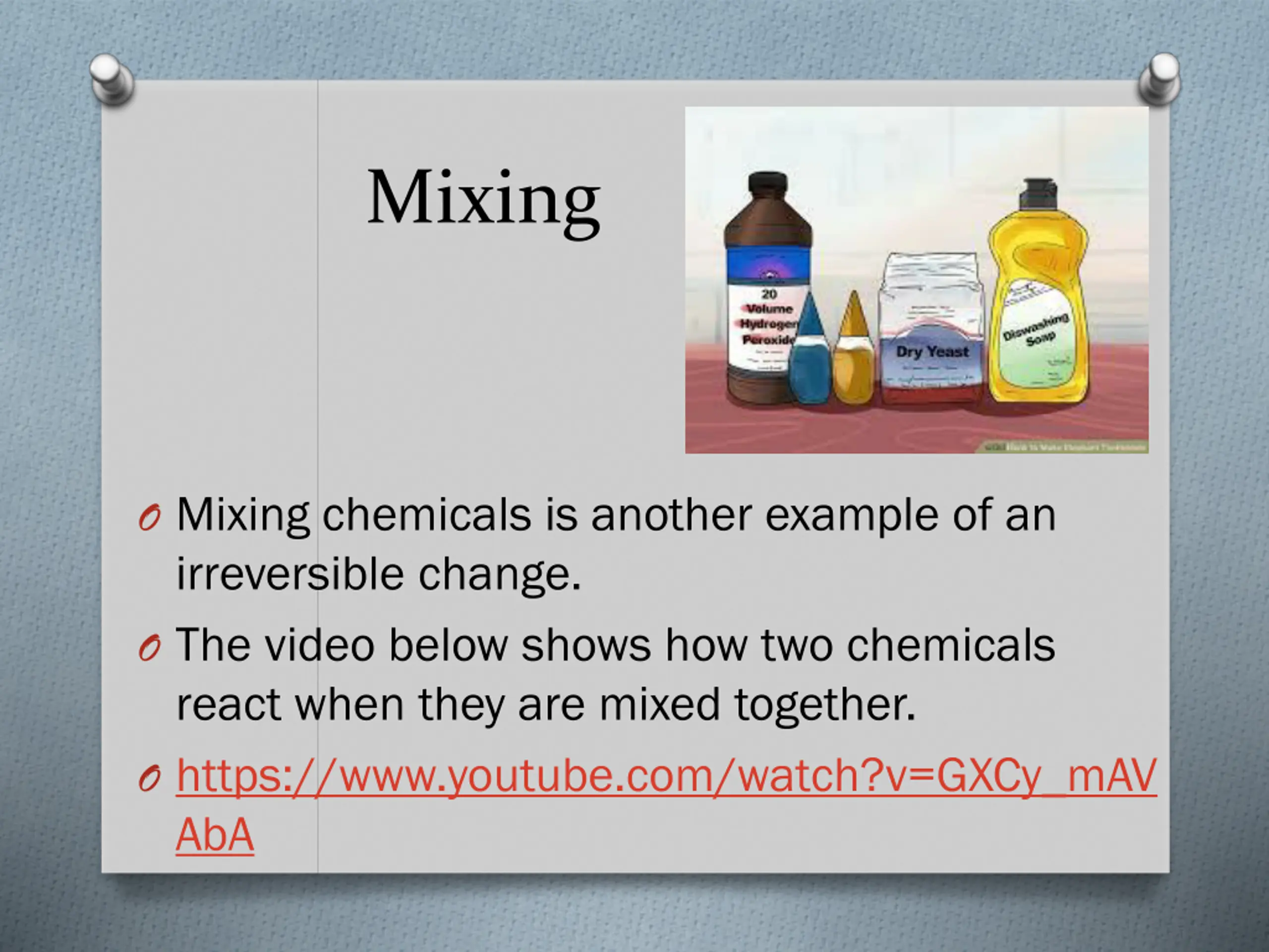 Mixing O Mixing chemicals is another example of an irreversible change. O The video below shows how two chemicals react when they are mixed together. O https://www.youtube.com/watch?v=GXCy_mAV AbA