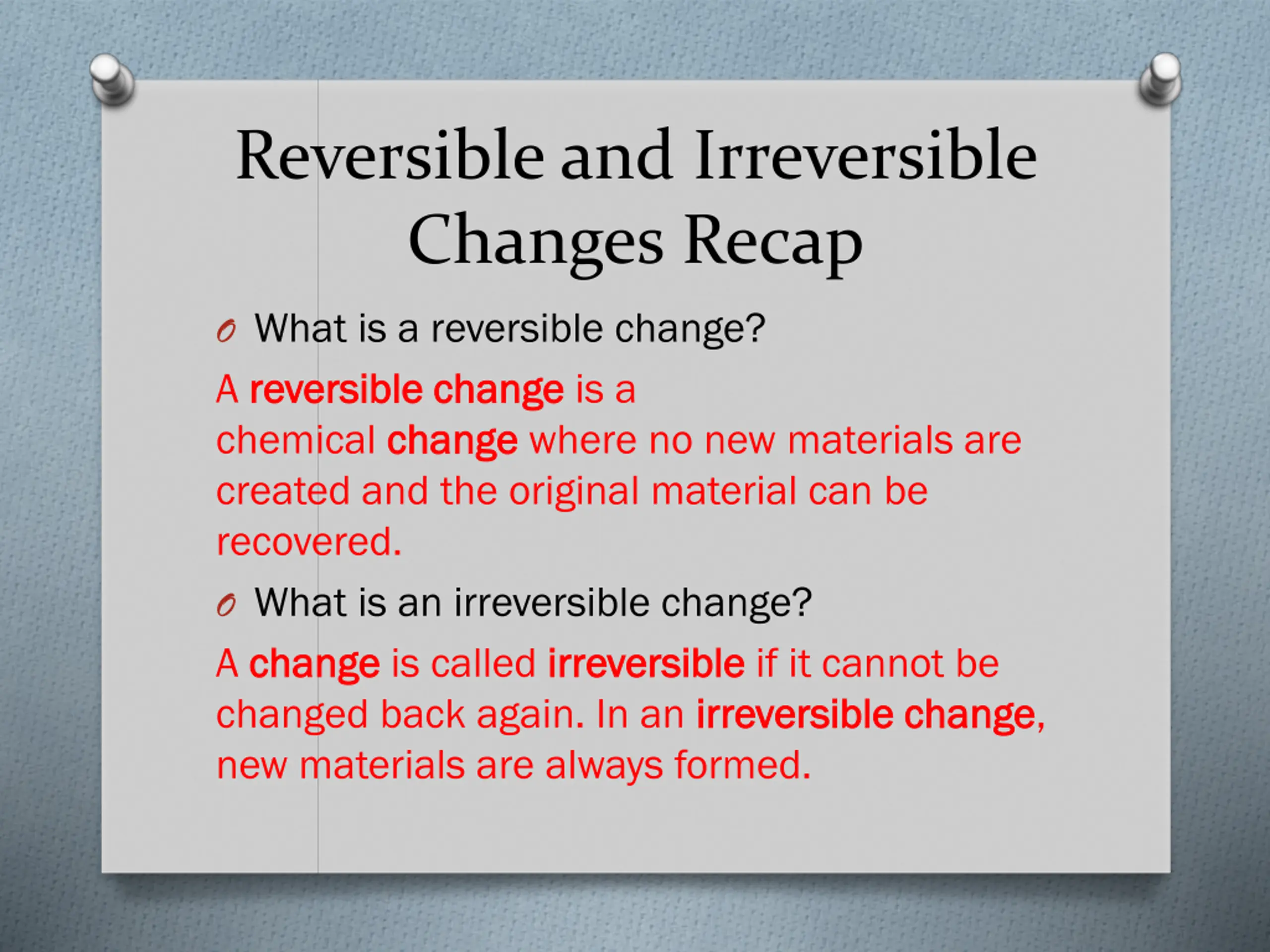 Reversible and Irreversible Changes Recap O What is a reversible change? A reversible change reversible change is a chemical change change where no new materials are created and the original material can be recovered. O What is an irreversible change? A change change is called irreversible irreversible if it cannot be changed back again. In an irreversible change new materials are always formed. irreversible change,