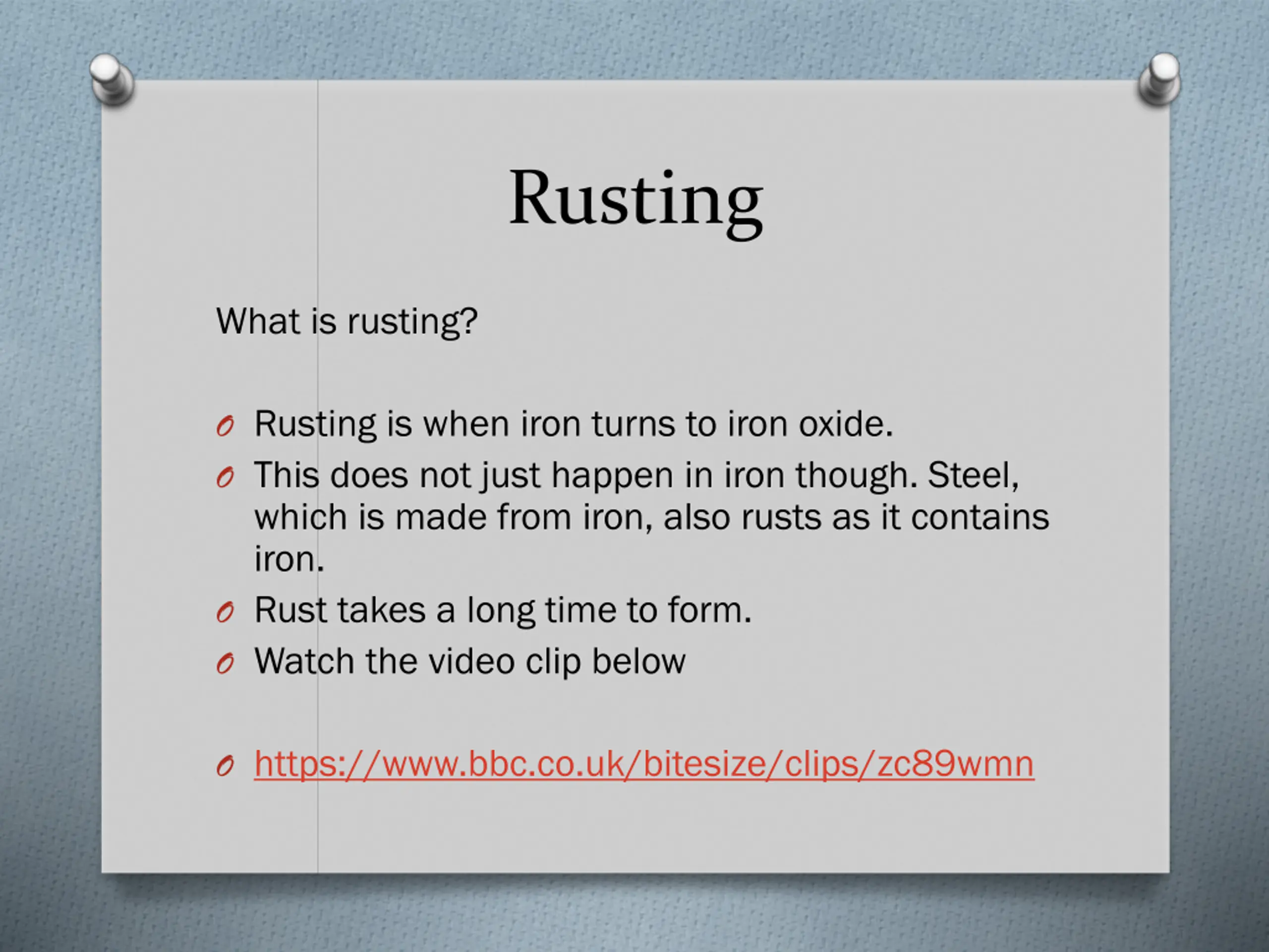 Rusting What is rusting? O Rusting is when iron turns to iron oxide. O This does not just happen in iron though. Steel, which is made from iron, also rusts as it contains iron. O Rust takes a long time to form. O Watch the video clip below O https://www.bbc.co.uk/bitesize/clips/zc89wmn