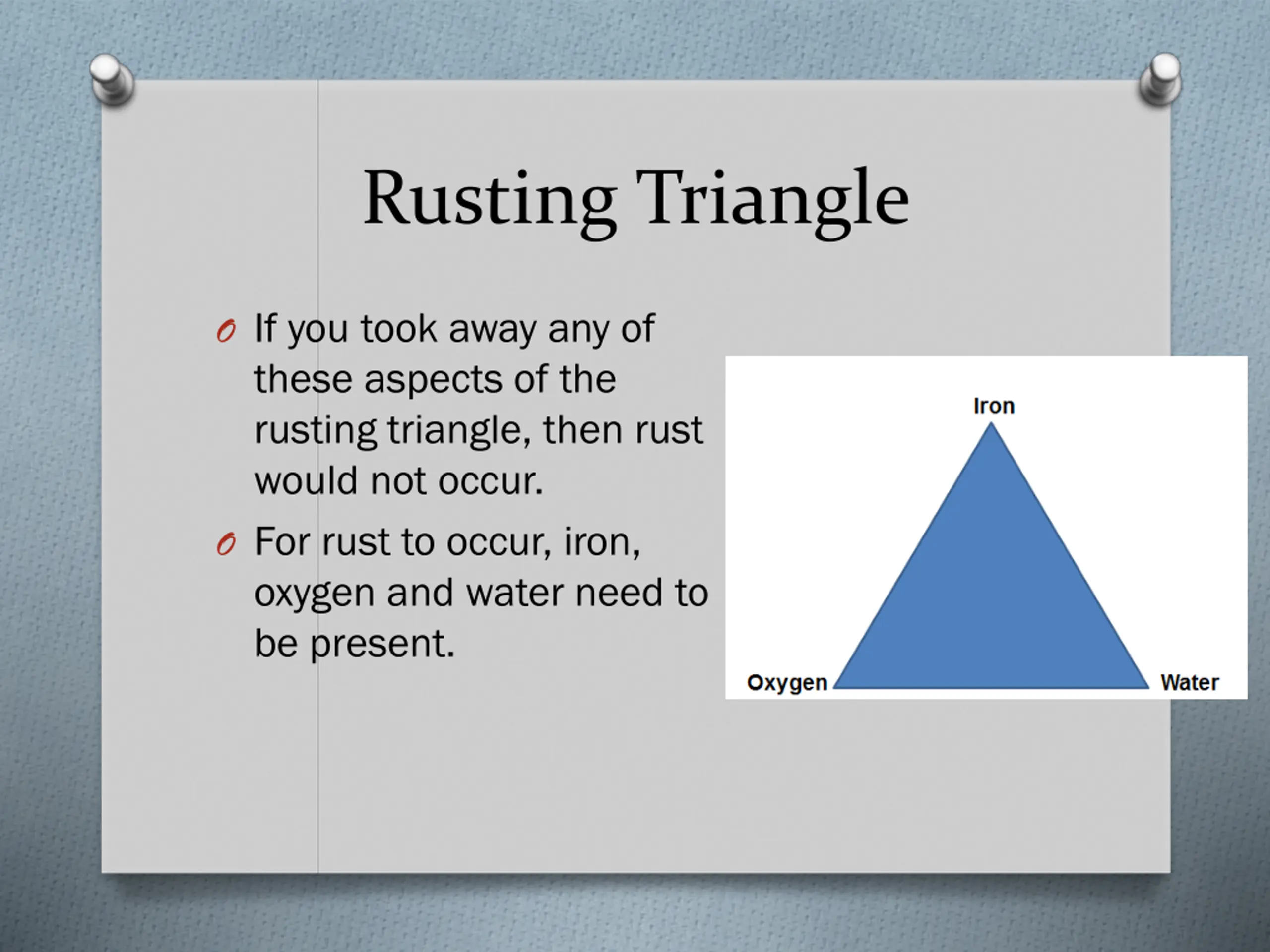 Rusting Triangle O If you took away any of these aspects of the rusting triangle, then rust would not occur. O For rust to occur, iron, oxygen and water need to be present.