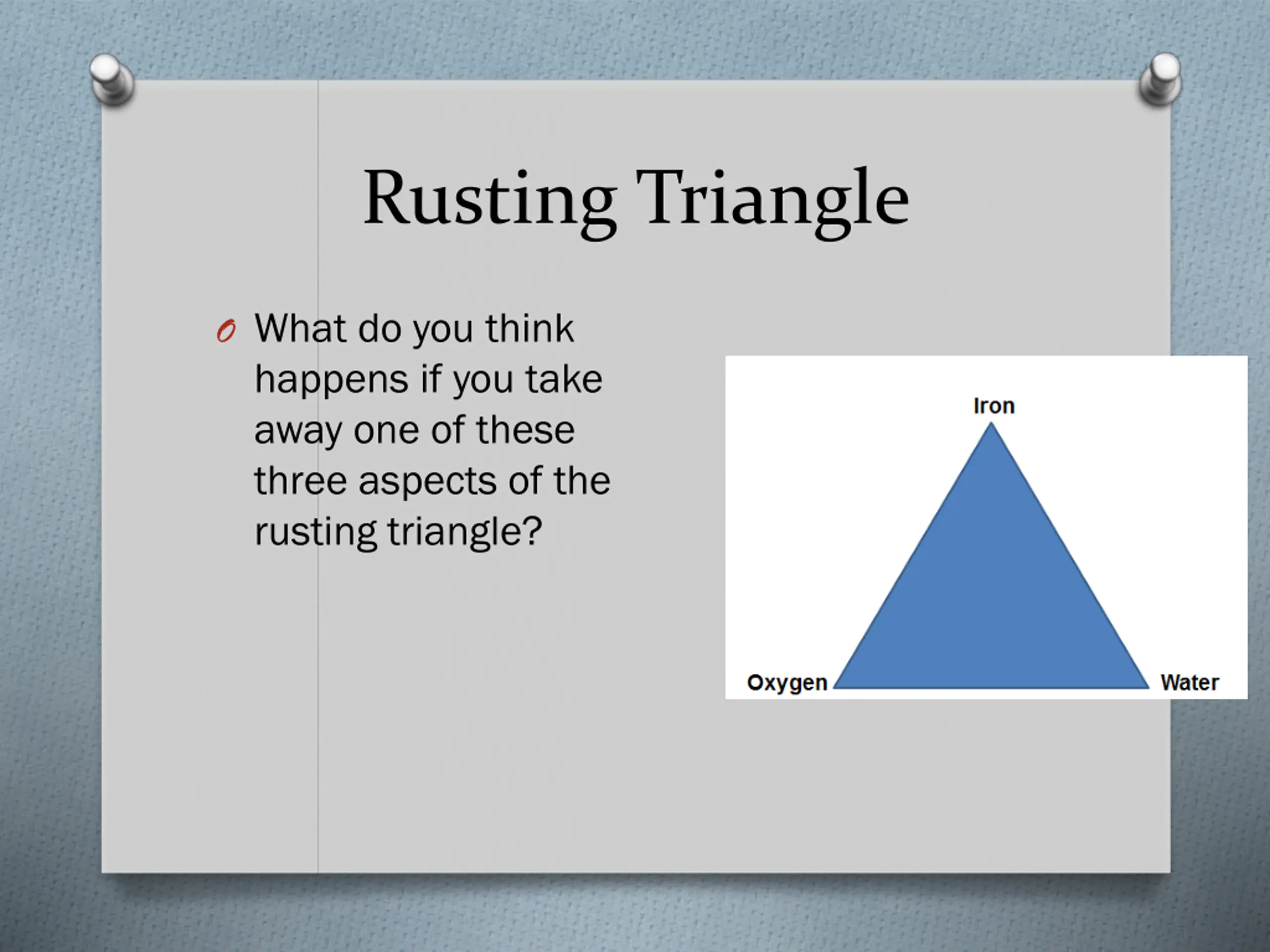 Rusting Triangle O What do you think happens if you take away one of these three aspects of the rusting triangle?