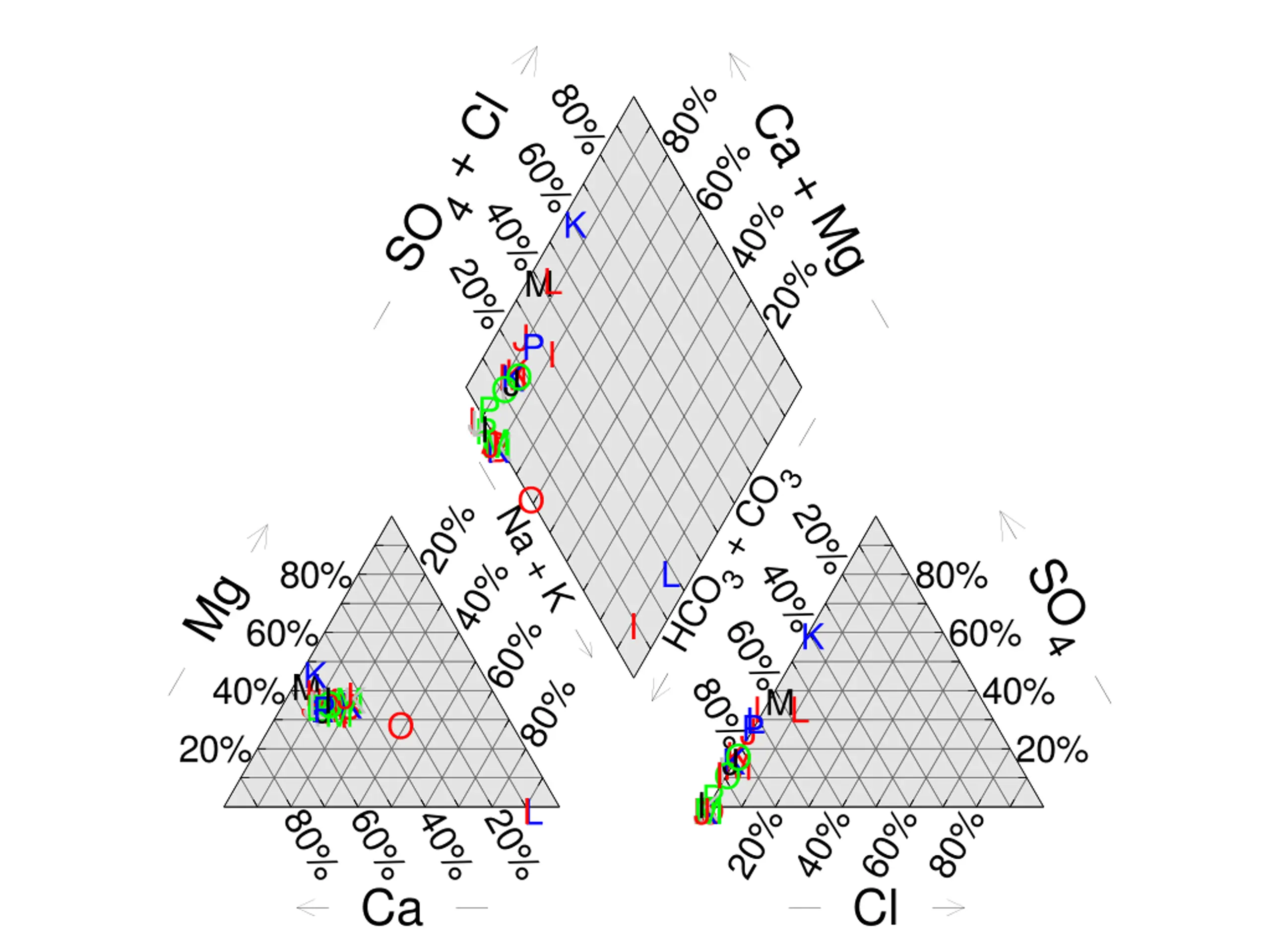 80% 60% 80% 60% 40% M L SO4 + Cl 20% Ca + Mg 20% 40% K J K M I M K M J P I J O K O P L P J L I P A B K HCO3 + CO3 O 20% 40% 20% 40% 60% 80% J K L O P A B K P J M K L M I J Na + K SO4 80% 80% L Mg I 60% 80% 60% 60% K K M L 40% 40% J J L M P I J K O P J L K A I P M K M I B K M O P I L L P O 20% 20% J O M I K O P I L I 20% 40% 60% Cl 80% 80% 60% Ca 40% 20%