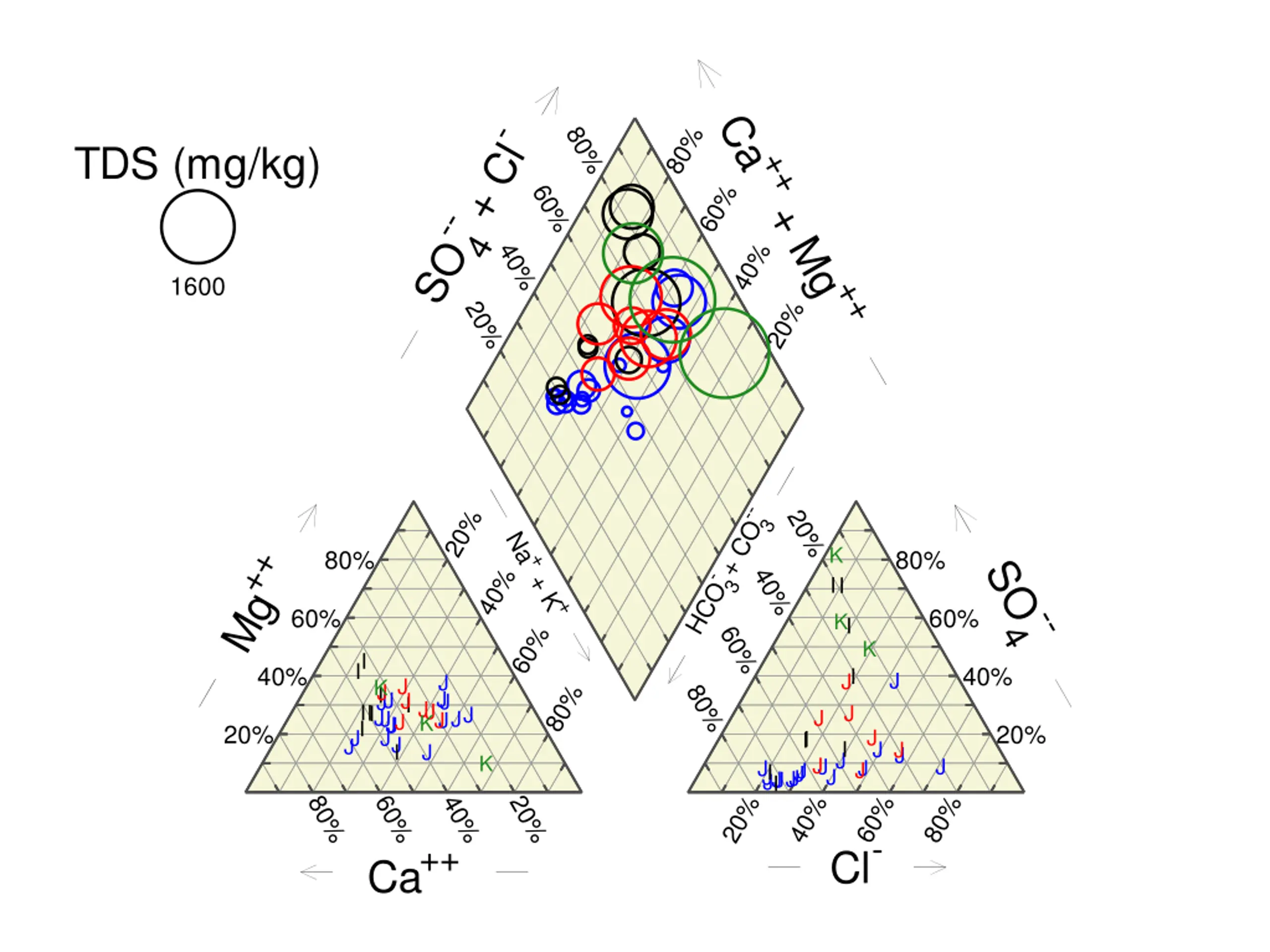 Ca++ + Mg++ 20% -- + Cl- 80% 80% TDS (mg/kg) 60% 60% SO4 40% 40% 1600 20% -- 20% 20% - + CO3 Na+ + K+ K Mg++ 80% 80% SO4 40% 40% I I HCO3 -- 60% 60% K I 60% 60% K I I 40% 40% I J J J J J K 80% 80% J I J J J J J J I J K J I I J I I J J J J J J J J J 20% 20% J J I I J I J I J J J J J K J J J J J J J I J J J J J J J J I 80% 60% Ca++ 40% 20% 20% 40% 60% Cl- 80%