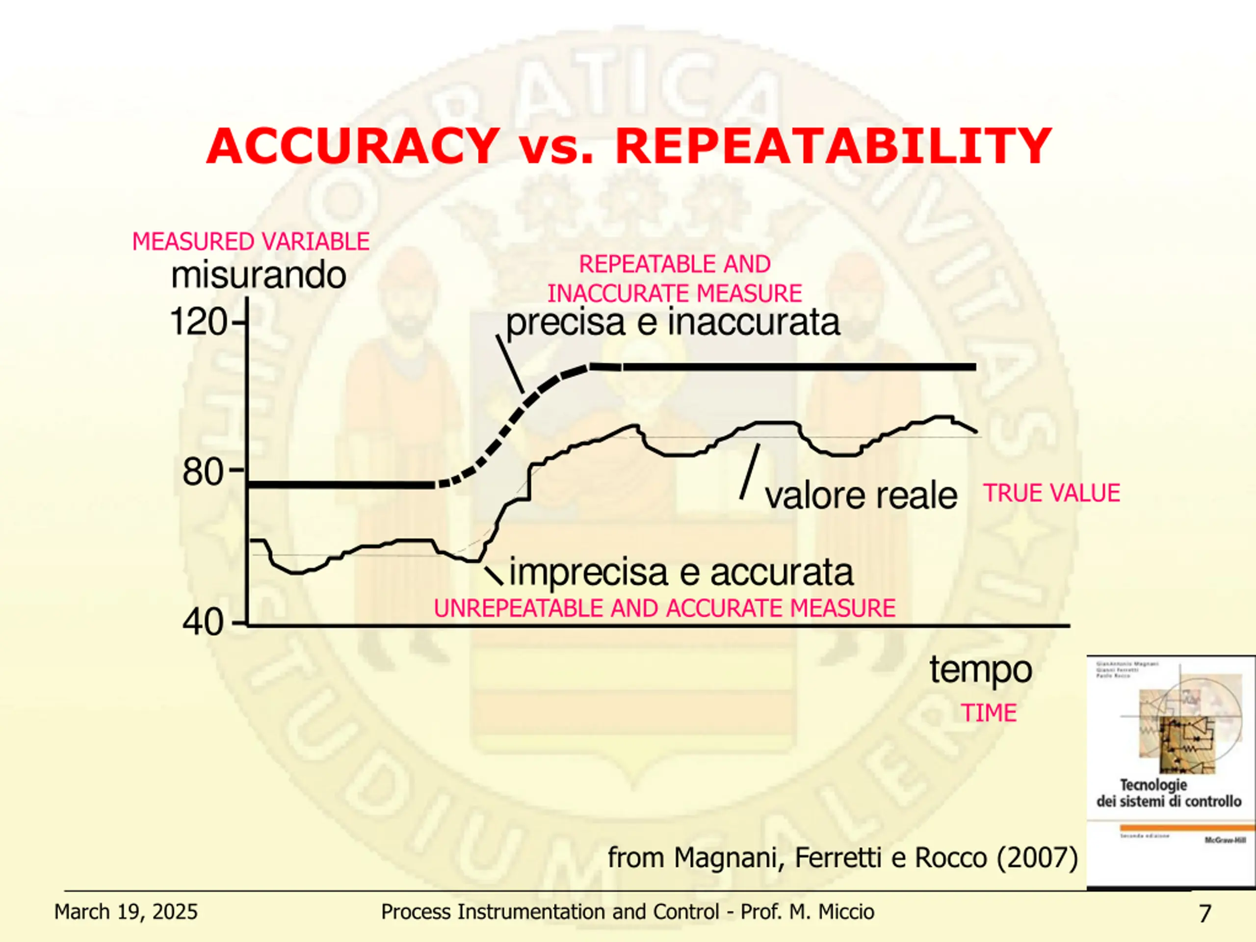 ACCURACY vs. REPEATABILITY MEASURED VARIABLE REPEATABLE AND INACCURATE MEASURE misurando 120 precisa e inaccurata 80 valore reale TRUE VALUE imprecisa e accurata UNREPEATABLE AND ACCURATE MEASURE 40 tempo TIME from Magnani, Ferretti e Rocco (2007) March 19, 2025 Process Instrumentation and Control - Prof. M. Miccio 7