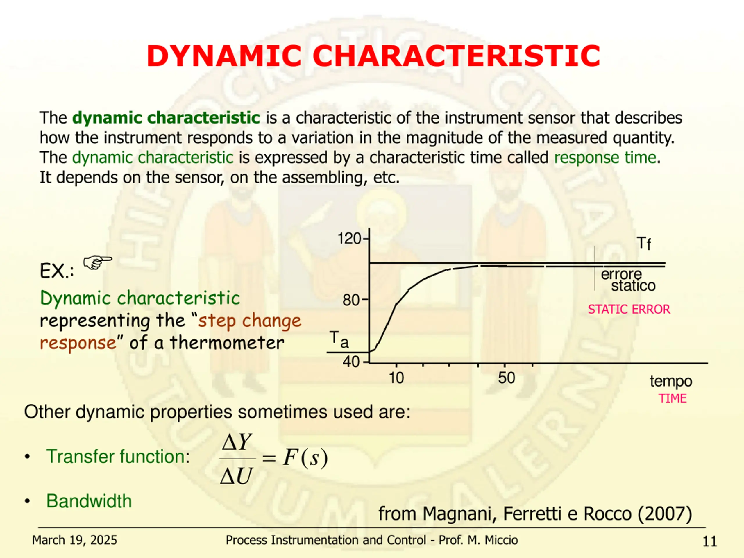 DYNAMIC CHARACTERISTIC The dynamic characteristic is a characteristic of the instrument sensor that describes how the instrument responds to a variation in the magnitude of the measured quantity. The dynamic characteristic is expressed by a characteristic time called response time. It depends on the sensor, on the assembling, etc. 120 T f EX.: Dynamic characteristic representing the step change response of a thermometer errore statico 80 STATIC ERROR Ta 40 10 50 tempo TIME Other dynamic properties sometimes used are: Y= (s ) F Transfer function: U Bandwidth from Magnani, Ferretti e Rocco (2007) March 19, 2025 Process Instrumentation and Control - Prof. M. Miccio 11