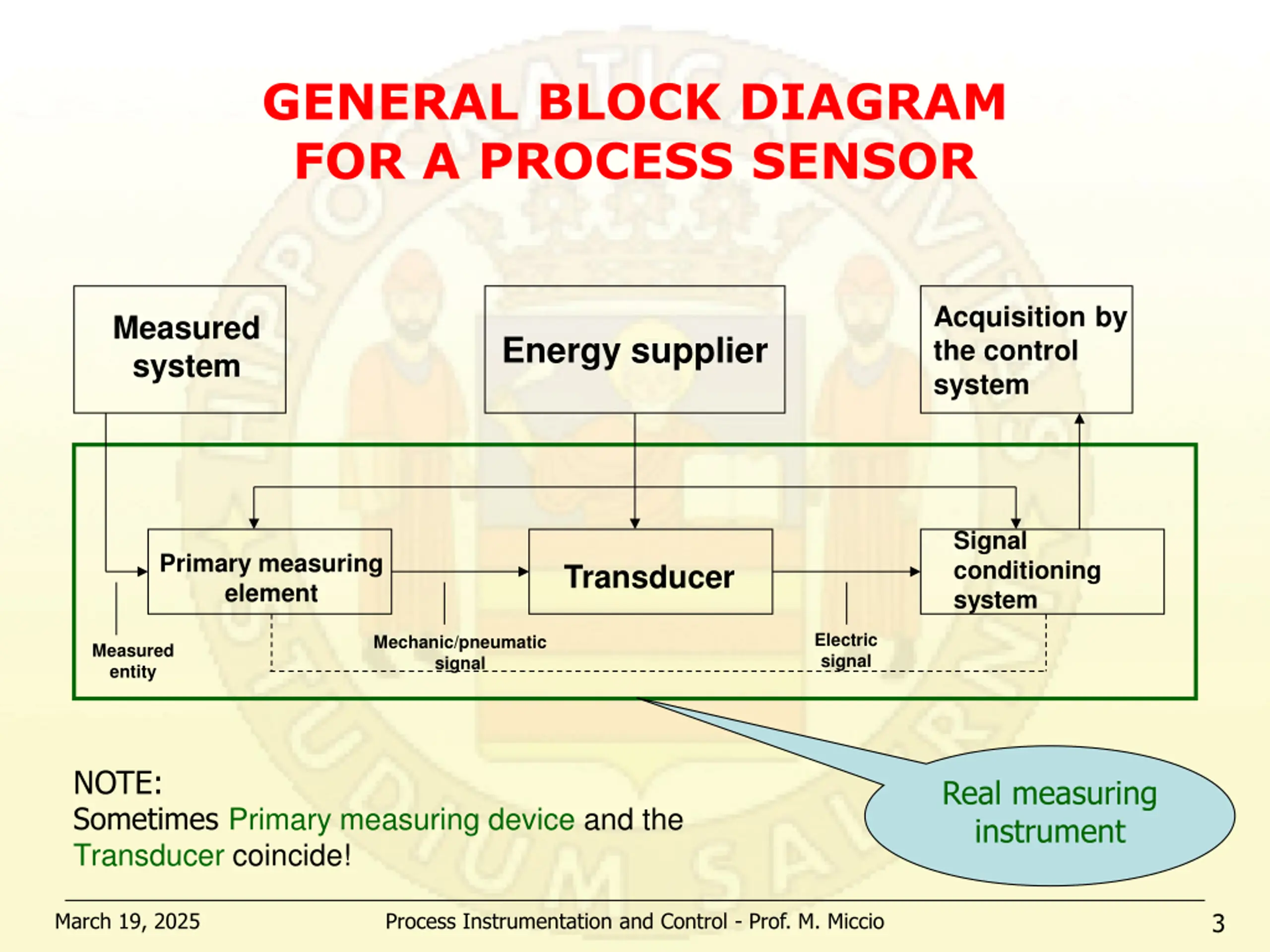 GENERAL BLOCK DIAGRAM FOR A PROCESS SENSOR Acquisition by the control system Measured system Energy supplier Signal conditioning system Primary measuring element Transducer Electric signal Mechanic/pneumatic signal Measured entity NOTE: Sometimes Primary measuring device and the Transducer coincide! Real measuring instrument March 19, 2025 Process Instrumentation and Control - Prof. M. Miccio 3