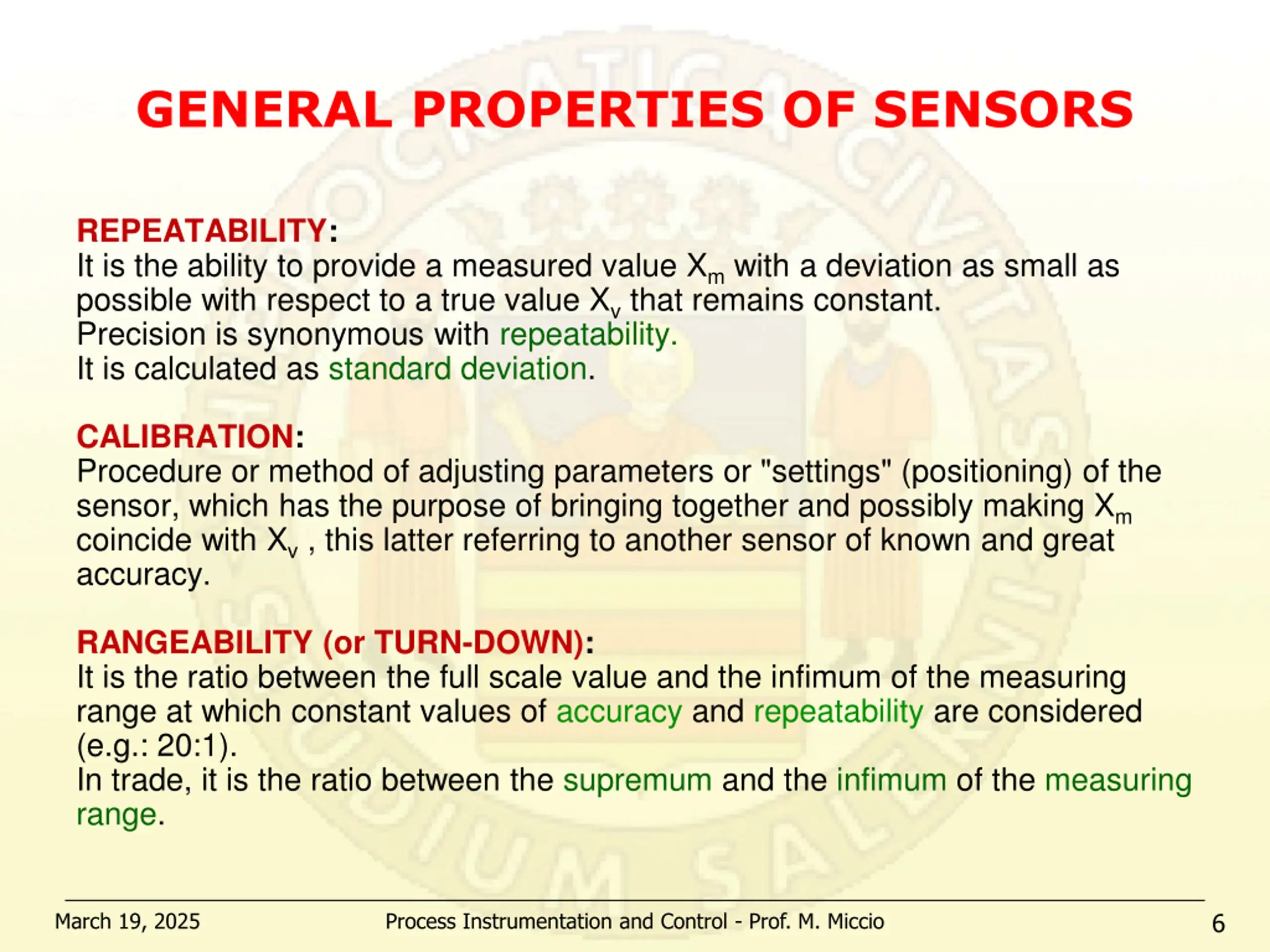 GENERAL PROPERTIES OF SENSORS REPEATABILITY: It is the ability to provide a measured value Xmwith a deviation as small as possible with respect to a true value Xvthat remains constant. Precision is synonymous with repeatability. It is calculated as standard deviation. CALIBRATION: Procedure or method of adjusting parameters or "settings" (positioning) of the sensor, which has the purpose of bringing together and possibly making Xm coincide with Xv, this latter referring to another sensor of known and great accuracy. RANGEABILITY (or TURN-DOWN): It is the ratio between the full scale value and the infimum of the measuring range at which constant values of accuracy and repeatability are considered (e.g.: 20:1). In trade, it is the ratio between the supremum and the infimum of the measuring range. March 19, 2025 Process Instrumentation and Control - Prof. M. Miccio 6