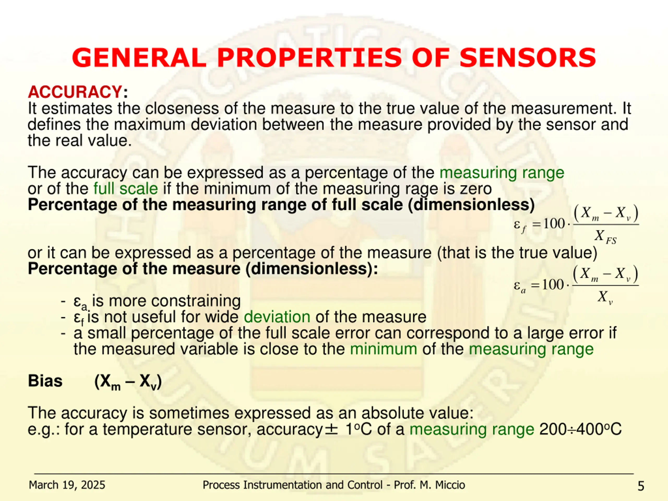 GENERAL PROPERTIES OF SENSORS ACCURACY: It estimates the closeness of the measure to the true value of the measurement. It defines the maximum deviation between the measure provided by the sensor and the real value. The accuracy can be expressed as a percentage of the measuring range or of the full scale if the minimum of the measuring rage is zero Percentage of the measuring range of full scale (dimensionless) ( ) X X m X v = 100 f FS or it can be expressed as a percentage of the measure (that is the true value) Percentage of the measure (dimensionless): ( ) X X m v = 100 a X - ais more constraining - fis not useful for wide deviation of the measure - a small percentage of the full scale error can correspond to a large error if the measured variable is close to the minimum of the measuring range v Bias (Xm Xv) The accuracy is sometimes expressed as an absolute value: e.g.: for a temperature sensor, accuracy 1oC of a measuring range 200 400oC March 19, 2025 Process Instrumentation and Control - Prof. M. Miccio 5