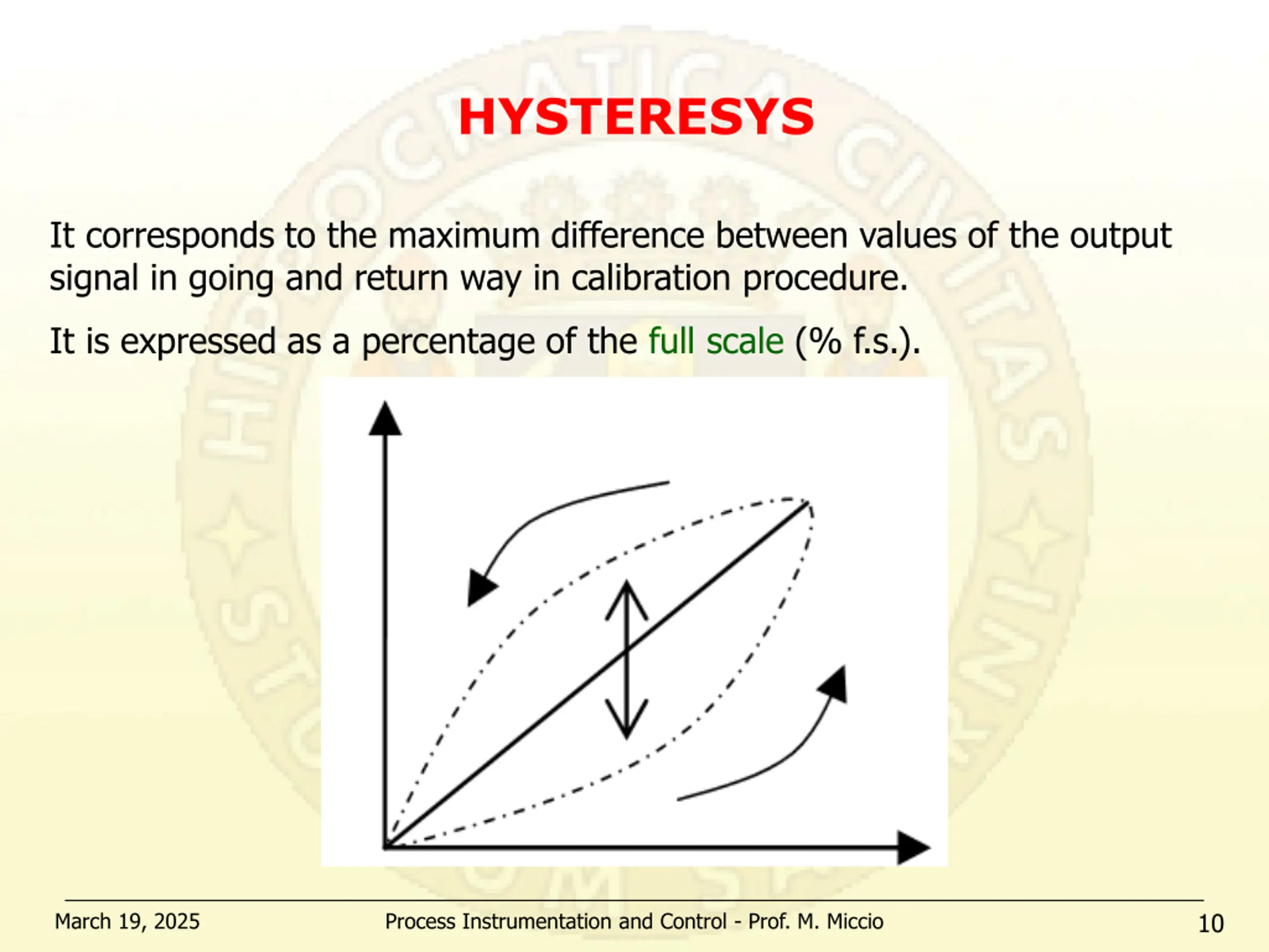HYSTERESYS It corresponds to the maximum difference between values of the output signal in going and return way in calibration procedure. It is expressed as a percentage of the full scale (% f.s.). March 19, 2025 Process Instrumentation and Control - Prof. M. Miccio 10