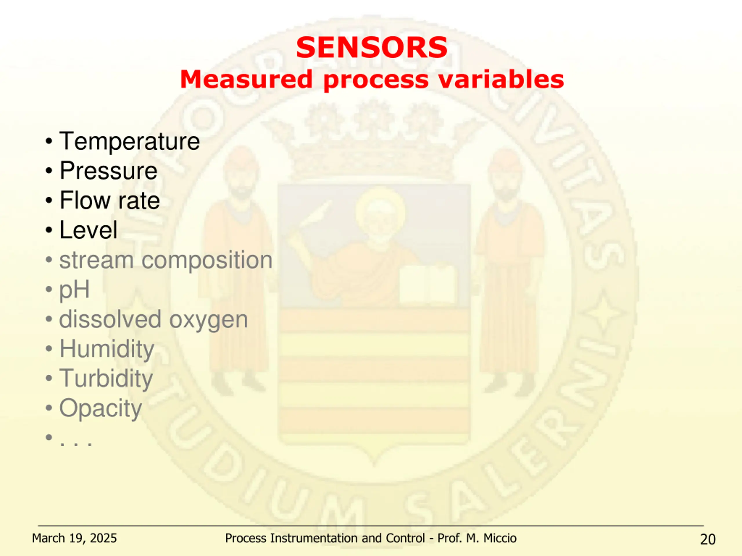 SENSORS Measured process variables Temperature Pressure Flow rate Level stream composition pH dissolved oxygen Humidity Turbidity Opacity . . . March 19, 2025 Process Instrumentation and Control - Prof. M. Miccio 20