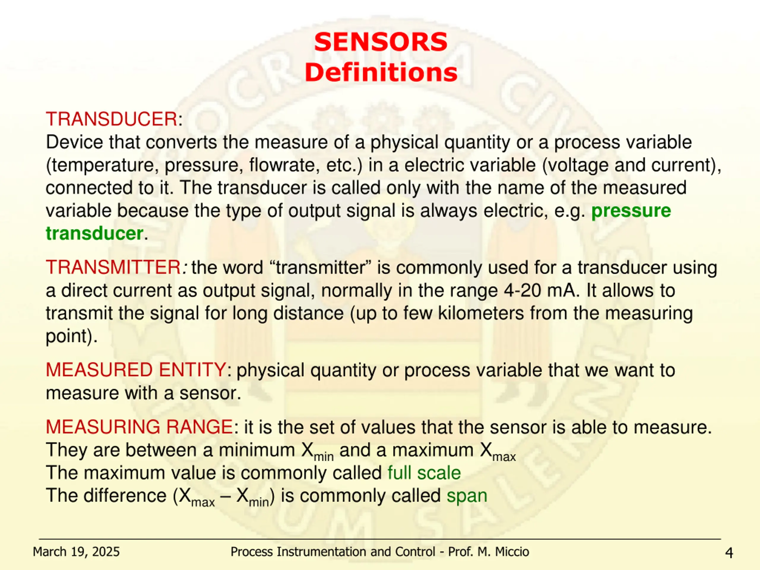 SENSORS Definitions TRANSDUCER: Device that converts the measure of a physical quantity or a process variable (temperature, pressure, flowrate, etc.) in a electric variable (voltage and current), connected to it. The transducer is called only with the name of the measured variable because the type of output signal is always electric, e.g. pressure transducer. TRANSMITTER: the word transmitter is commonly used for a transducer using a direct current as output signal, normally in the range 4-20 mA. It allows to transmit the signal for long distance (up to few kilometers from the measuring point). MEASURED ENTITY: physical quantity or process variable that we want to measure with a sensor. MEASURING RANGE: it is the set of values that the sensor is able to measure. They are between a minimum Xminand a maximum Xmax The maximum value is commonly called full scale The difference (Xmax Xmin) is commonly called span March 19, 2025 Process Instrumentation and Control - Prof. M. Miccio 4